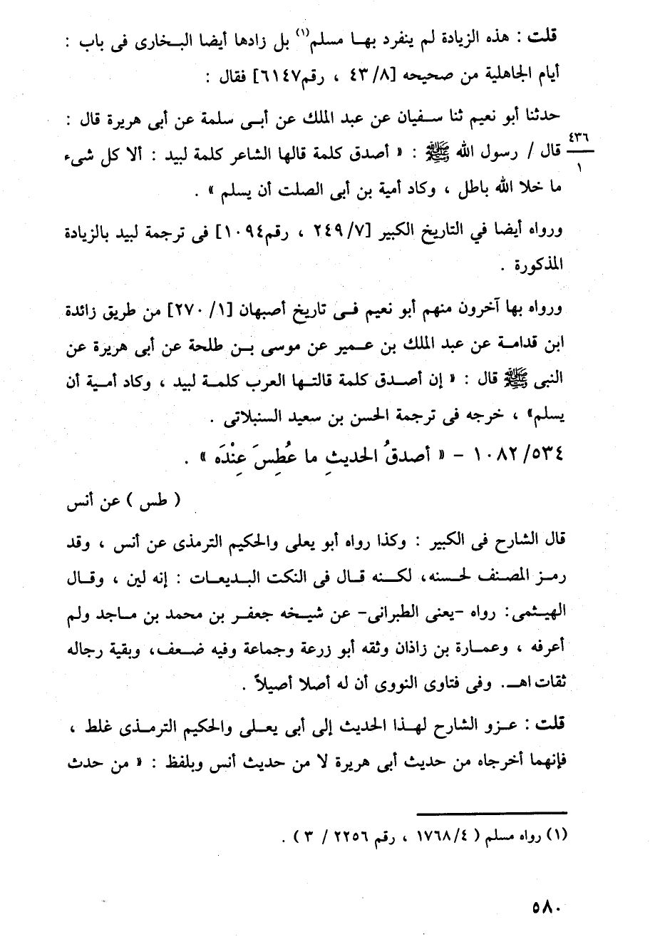 ورواه بها آخرون منهم أبو نعيم في تاريخ أصبهان [1/ 270] من طريق زائدة ابن قدامة عن عبد الملك بن عمير عن موسى بن طلحة عن أبي هريرة عن النبي -صلى اللَّه عليه وسلم- قال: "إن أصدق كلمة قالتها العرب كلمة لبيد، وكاد أمية أن يسلم"، خرجه في ترجمة الحسن بن سعيد السنبلاتى.