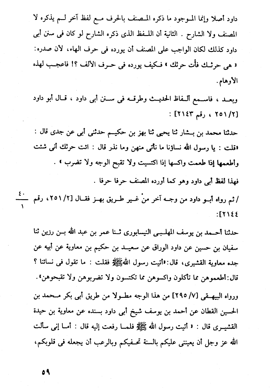 حدثنا محمد بن بشار ثنا يحيى ثنا بهز بن حكيم حدثنى أبي عن جدى قال: "قلت: يا رسول اللَّه نساؤنا ما نأتى منهن وما نذر قال: ائت حرثك أنى شئت وأطعمها إذا طعمت واكسها إذا اكتسيت ولا تقبح الوجه ولا تضرب".