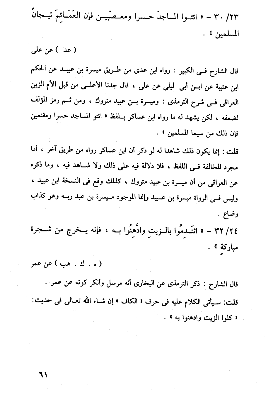24/ 32 - "ائتَدِمُوا بالزيتِ وادَّهنُوا به، فإنه يخرج من شجرة مباركةٍ". (هـ. ك. هب) عن عمر