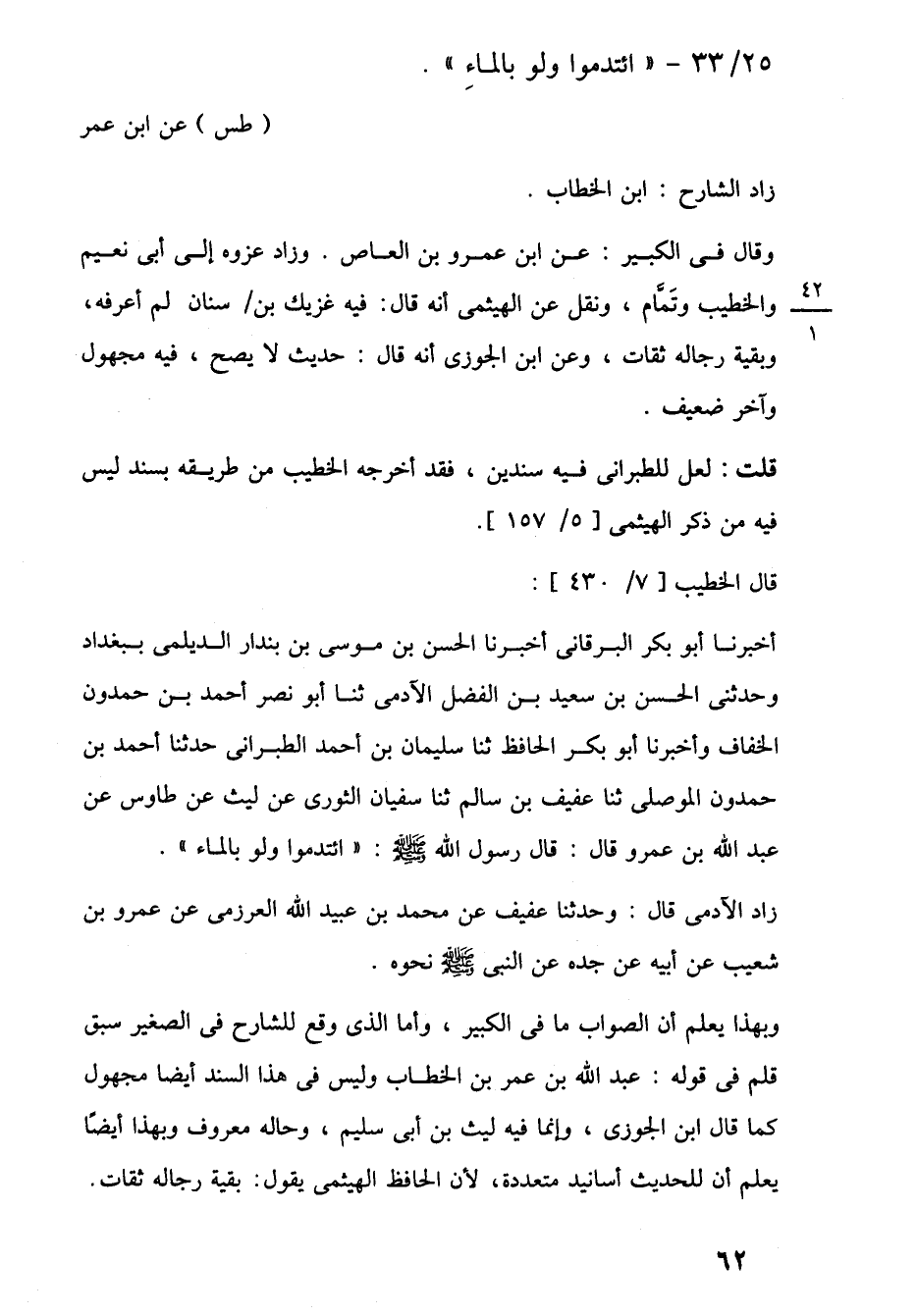 25/ 33 - "ائتدموا ولو بالماءِ". (طس) عن ابن عمر