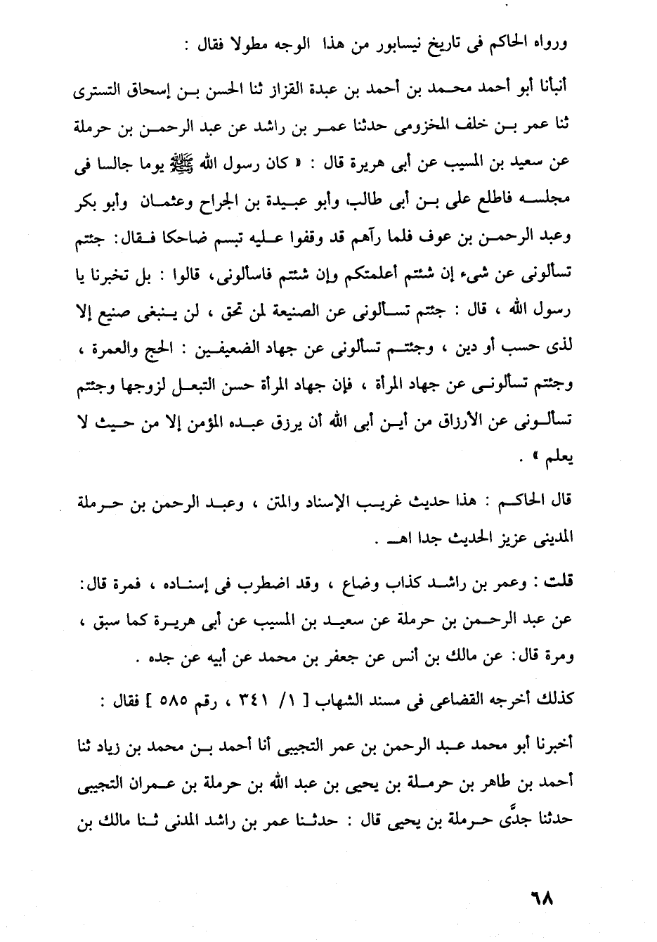أنبأنا أبو أحمد محمد بن أحمد بن عبدة القزاز ثنا الحسن بن إسحاق التسترى ثنا عمر بن خلف المخزومى حدثنا عمر بن راشد عن عبد الرحمن بن حرملة عن سعيد بن المسيب عن أبي هريرة قال: "كان رسول اللَّه -صلى اللَّه عليه وسلم- يوما جالسا في مجلسه فاطلع على بن أبي طالب وأبو عبيدة بن الجراح وعثمان وأبو بكر وعبد الرحمن بن عوف فلما رآهم قد وقفوا عليه تبسم ضاحكا فقال: جئتم تسألونى عن شيء إن شتم أعلمتكم وإن شئتم فاسألونى، قالوا: بل تخبرنا يا رسول اللَّه، قال: جئتم تسألونى عن الصنيعة لمن تحق، لن ينبغى صنيع إلا لذى حسب أو دين، وجئتم تسألونى عن جهاد الضعيفين: الحج والعمرة، وجئتم تسألونى عن جهاد المرأة، فإن جهاد المرأة حسن التبعل لزوجها وجئتم تسألونى عن الأرزاق من أين أبى اللَّه أن يرزق عبده المؤمن إلا من حيث لا يعلم".
