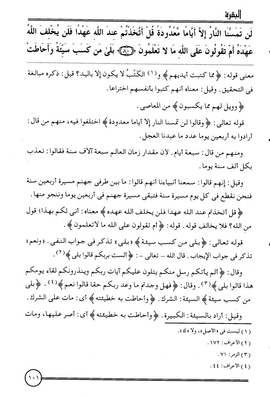 {لن تمسنا النَّار إِلَّا أَيَّامًا مَعْدُودَة قل أتخذتم عِنْد الله عهدا فَلَنْ يخلف الله عَهده أم تَقولُونَ على الله مَا لَا تعلمُونَ (80) بلَى من كسب سَيِّئَة وأحاطت} معنى قَوْله: {مِمَّا كتبت أَيْديهم} والكتب لَا يكون إِلَّا بِالْيَدِ؟ قيل: ذكره مُبَالغَة فِي التَّحْقِيق. وَقيل: مَعْنَاهُ أَنهم كتبُوا بِأَنْفسِهِم اختراعا.