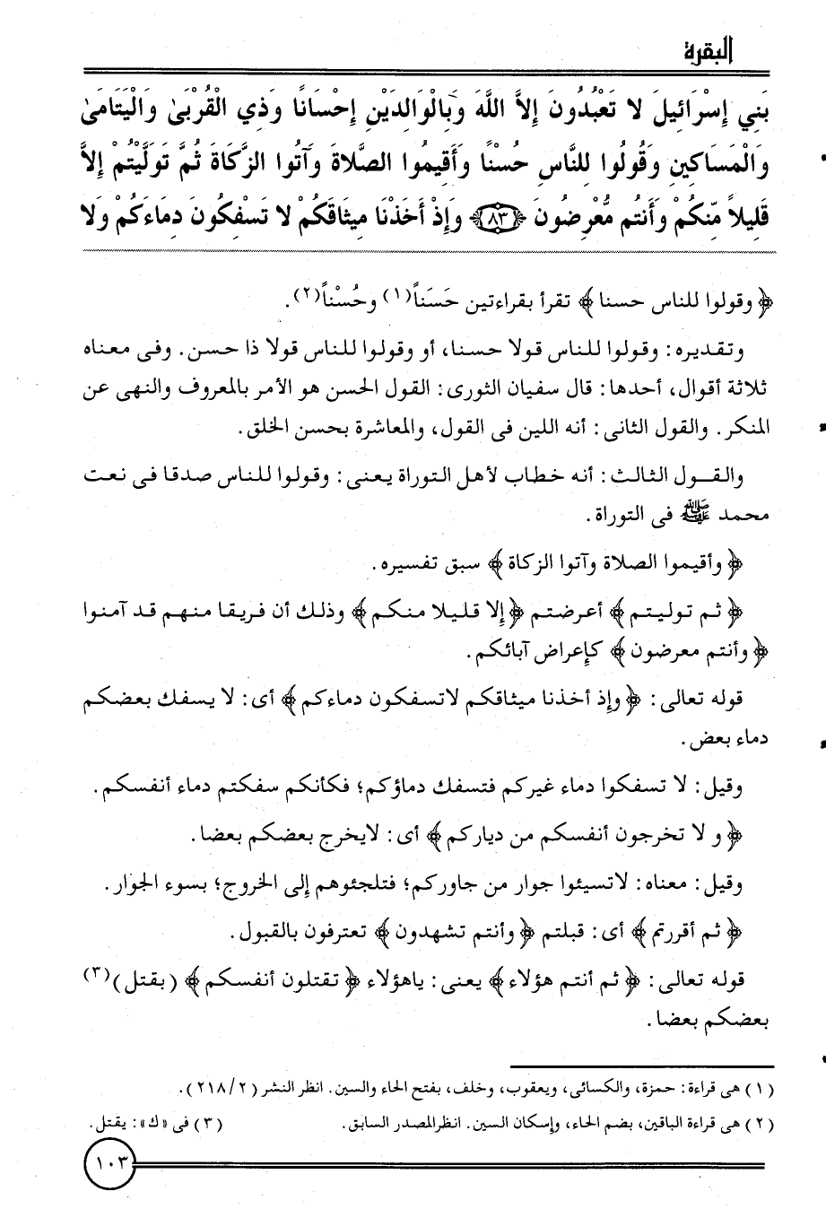 {بني إِسْرَائِيل لَا تَعْبدُونَ إِلَّا الله وبالوالدين إحسانا وَذي الْقُرْبَى واليتامى وَالْمَسَاكِين وَقُولُوا للنَّاس حسنا وَأقِيمُوا الصَّلَاة وَآتوا الزَّكَاة ثمَّ توليتم إِلَّا قَلِيلا مِنْكُم وَأَنْتُم معرضون (83) وَإِذ أَخذنَا ميثاقكم لَا تسفكون دماءكم وَلَا} {وَقُولُوا للنَّاس حسنا} تقْرَأ بقراءتين حسنا وحسنا.