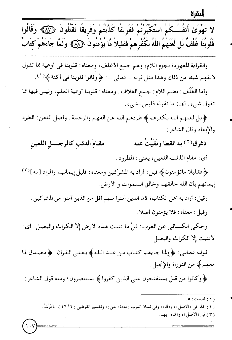 {لَا تهوى أَنفسكُم استكبرتم ففريقا كَذبْتُمْ وفريقا تقتلون (87) وَقَالُوا قُلُوبنَا غلف بل لعنهم الله بكفرهم فقليلا مَا يُؤمنُونَ (88) وَلما جَاءَهُم كتاب} وَالْقِرَاءَة الْمَعْهُودَة بجزم اللَّام، وهم جمع الأغلف، وَمَعْنَاهُ: قُلُوبنَا فِي أوعية مِمَّا تَقول لَا نفهم شَيْئا من ذَلِك وَهَذَا مثل قَوْله تَعَالَى: {وَقَالُوا قُلُوبنَا فِي أكنة} .