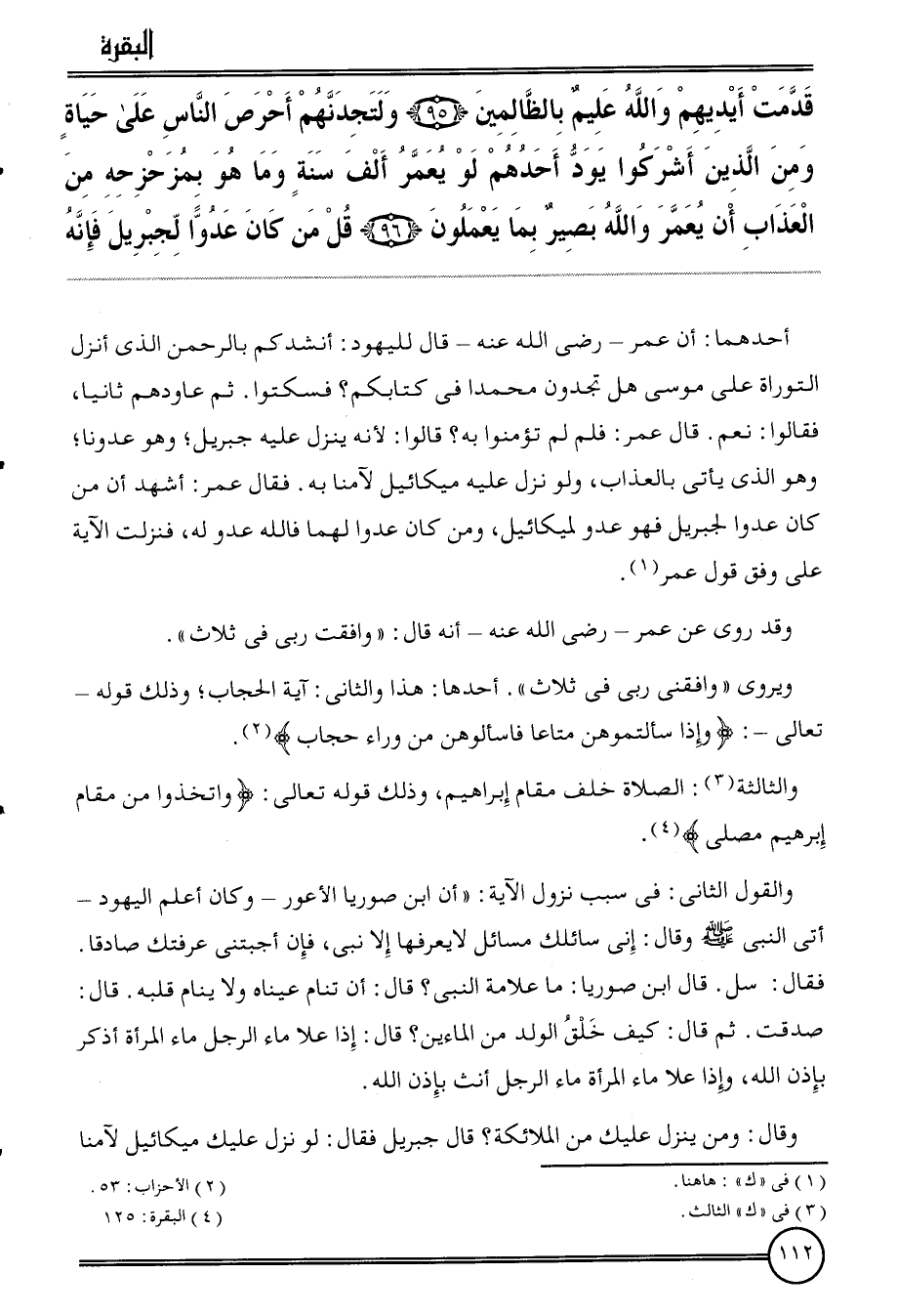 {قدمت أَيْديهم وَالله عليم بالظالمين (95) ولتجدنهم أحرص النَّاس على حَيَاة وَمن الَّذين أشركوا يود أحدهم لَو يعمر ألف سنة وَمَا هُوَ بمزحزحه من الْعَذَاب أَن يعمر وَالله بَصِير بِمَا يعْملُونَ (96) قل من كَانَ عدوا لجبريل فَإِنَّهُ}
