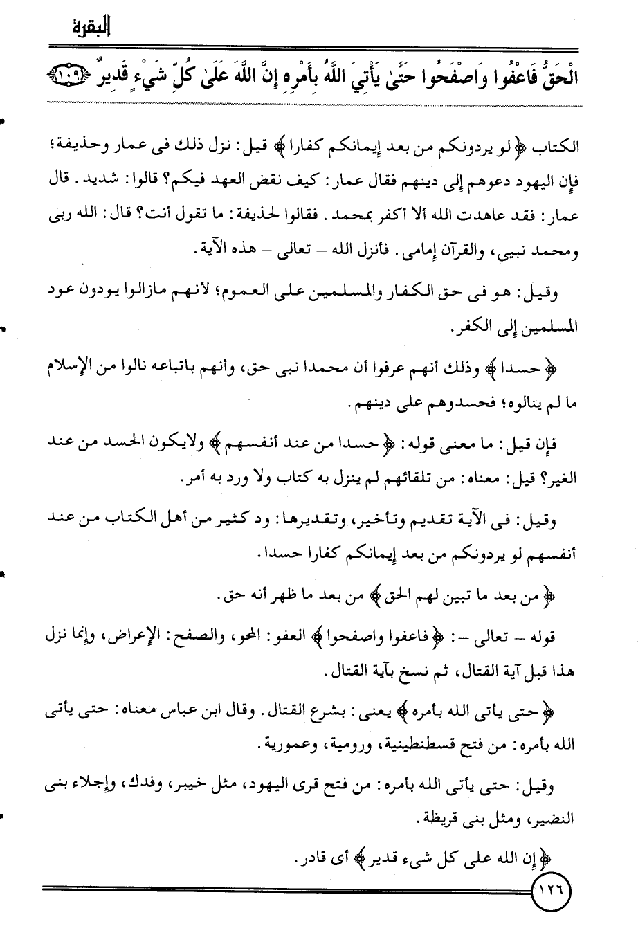 {الْحق فاعفوا واصفحوا حَتَّى يَأْتِي الله بأَمْره إِن الله على كل شَيْء قدير (109) الْكتاب {لَو يردونكم من بعد إيمَانكُمْ كفَّارًا} قيل: نزل ذَلِك فِي عمار وَحُذَيْفَة؛ فَإِن الْيَهُود دعوهم إِلَى دينهم فَقَالَ عمار: كَيفَ نقض الْعَهْد فِيكُم؟ قَالُوا: شَدِيد. قَالَ عمار: فقد عَاهَدت الله أَلا أكفر بِمُحَمد. فَقَالُوا لِحُذَيْفَة: مَا تَقول أَنْت؟ قَالَ: الله ربى وَمُحَمّد نبيي، وَالْقُرْآن إمامي. فَأنْزل الله تَعَالَى هَذِه الْآيَة.