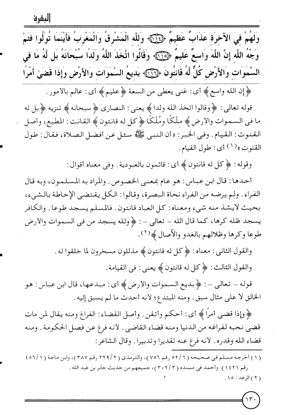 {وَلَهُم فِي الْآخِرَة عَذَاب عَظِيم (114) وَللَّه الْمشرق وَالْمغْرب فأينما توَلّوا فثم وَجه الله إِن الله وَاسع عليم (115) وَقَالُوا اتخذ الله ولدا سُبْحَانَهُ بل لَهُ مَا فِي السَّمَاوَات وَالْأَرْض كل لَهُ قانتون (116) بديع السَّمَاوَات وَالْأَرْض وَإِذا قضى أمرا}