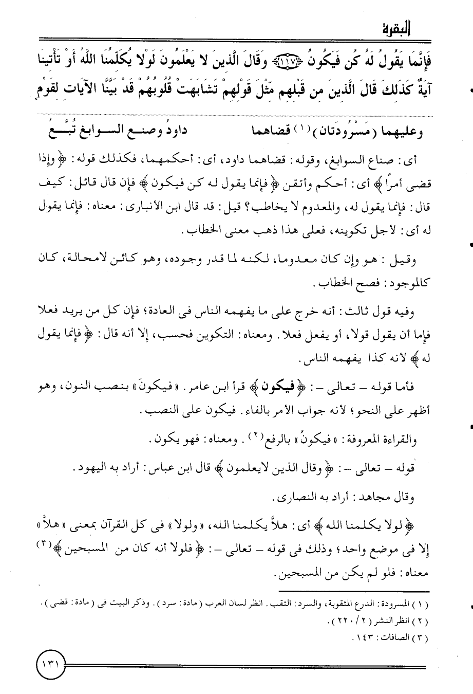 أَي: صناع السوابغ، وَقَوله: قضاهما دَاوُد، أَي: أحكمهما، فَكَذَلِك قَوْله: {وَإِذا قضى أمرا} أَي: أحكم وأتقن {فَإِنَّمَا يَقُول لَهُ كن فَيكون} فَإِن قَالَ قَائِل: كَيفَ قَالَ: فَإِنَّمَا يَقُول لَهُ، والمعدوم لَا يُخَاطب؟ قيل: قد قَالَ ابْن الْأَنْبَارِي: مَعْنَاهُ: فَإِنَّمَا يَقُول لَهُ أَي: لأجل تكوينه، فعلى هَذَا ذهب معنى الْخطاب.