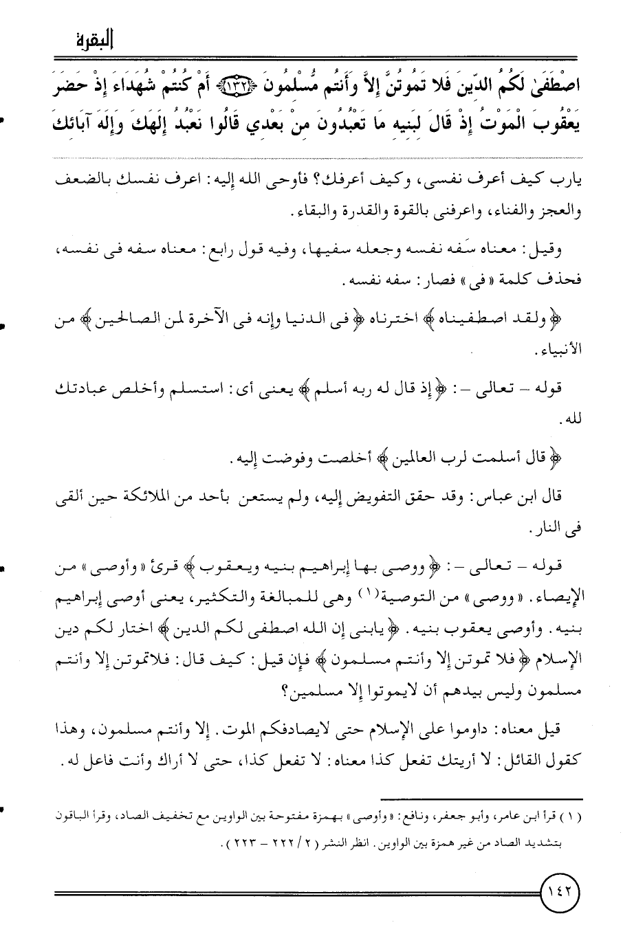 قَوْله تَعَالَى: {ووصى بهَا إِبْرَاهِيم بنيه وَيَعْقُوب} قرىء " وَأوصى " من الْإِيصَاء. " ووصى " من التوصية وَهِي للْمُبَالَغَة والتكثير، يَعْنِي أوصى إِبْرَاهِيم بنيه. وَأوصى يَعْقُوب بنيه. {يَا بني إِن الله اصْطفى لكم الدّين} اخْتَار لكم دين الْإِسْلَام {فَلَا تموتن إِلَّا وَأَنْتُم مُسلمُونَ} فَإِن قيل: كَيفَ قَالَ: فَلَا تموتمن إِلَّا وَأَنْتُم مُسلمُونَ وَلَيْسَ بيدهم أَن لَا يموتوا إِلَّا مُسلمين؟