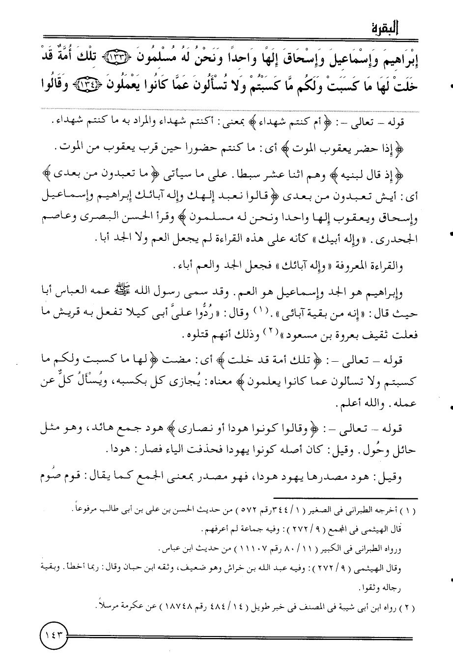 {إِبْرَاهِيم وَإِسْمَاعِيل وَإِسْحَاق إِلَهًا وَاحِدًا وَنحن لَهُ مُسلمُونَ (133) تِلْكَ أمة قد خلت لَهَا مَا كسبت وَلكم مَا كسبتم وَلَا تسْأَلُون عَمَّا كَانُوا يعْملُونَ (134) وَقَالُوا}