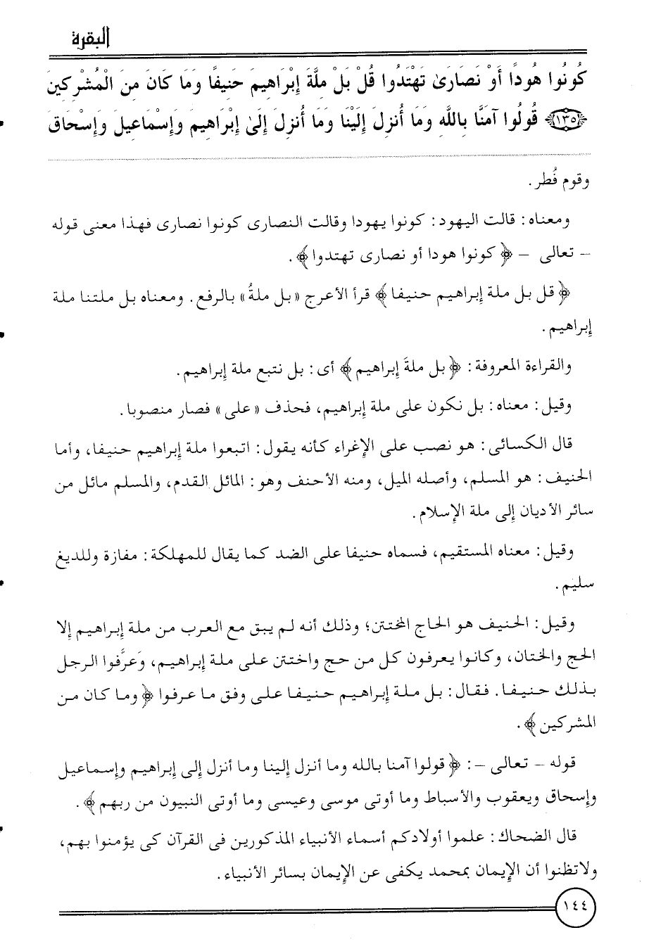 {كونُوا هودا أَو نَصَارَى تهتدوا قل بل مِلَّة إِبْرَاهِيم حَنِيفا وَمَا كَانَ من الْمُشْركين (135) قُولُوا آمنا بِاللَّه وَمَا أنزل إِلَيْنَا وَمَا أنزل إِلَى إِبْرَاهِيم وَإِسْمَاعِيل وَإِسْحَاق} وَقوم فطر.