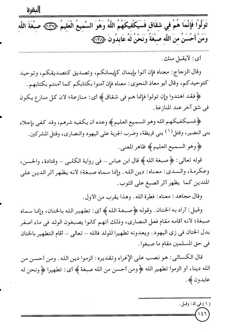 وَقيل: أَرَادَ بِهِ الْخِتَان. وَقَوله (صبغة الله) أَي: تَطْهِير الله بالختان، وَإِنَّمَا سَمَّاهُ صبغة؛ لِأَنَّهُ أَقَامَهُ مقَام فعل النَّصَارَى، وَذَلِكَ أَنهم كَانُوا يصبغون الْوَلَد فِي مَاء أصفر بدل الْخِتَان فِي زِيّ الْيَهُود. ويعدونه تَطْهِيرا للْوَلَد فَالله تَعَالَى أَقَامَ التَّطْهِير بالختان فِي حق الْمُسلمين مقَام مَا صبغوا.
