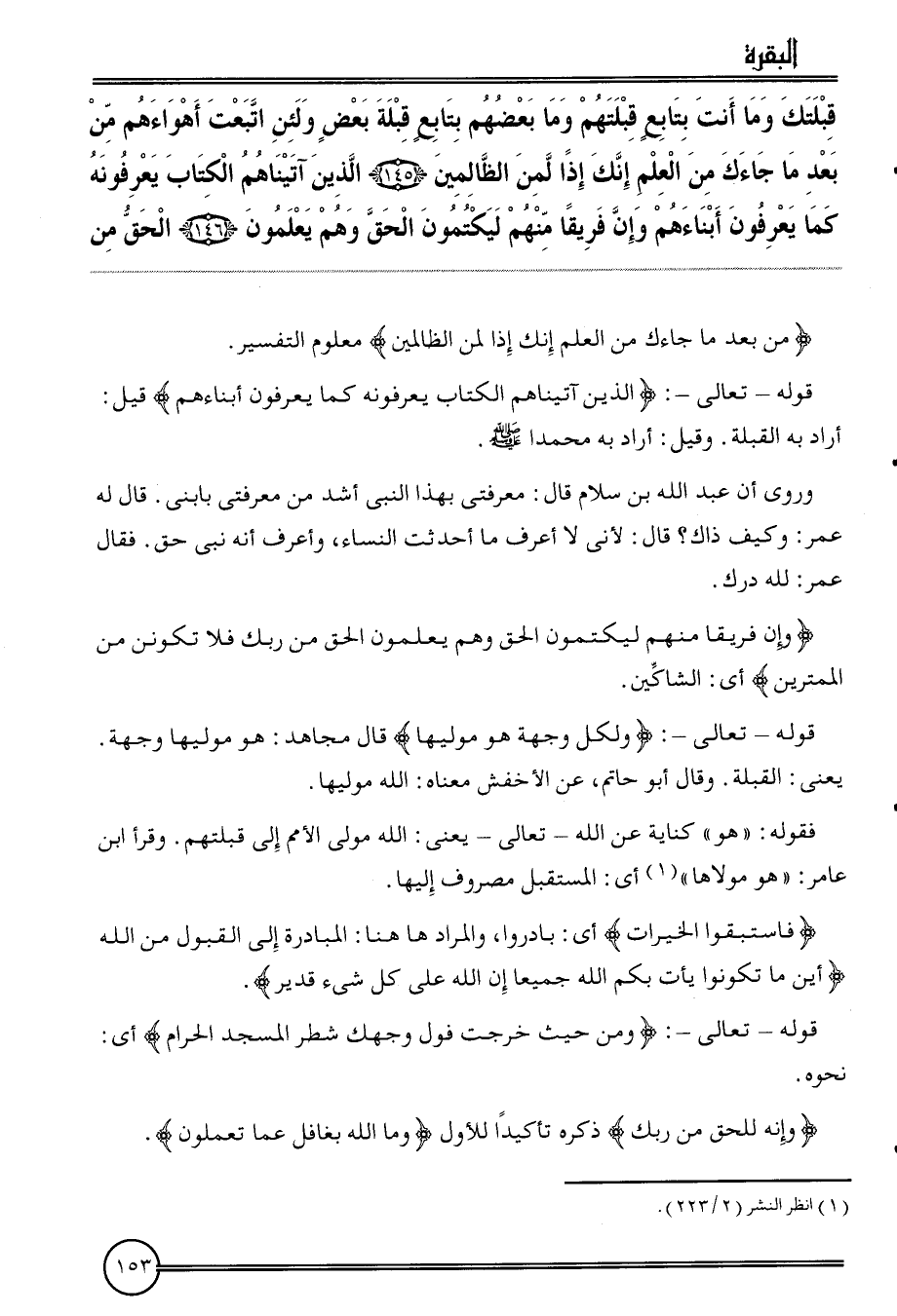 {قبلتك وَمَا أَنْت بتابع قبلتهم وَمَا بَعضهم بتابع قبْلَة بعض وَلَئِن اتبعت أهواءهم من بعد مَا جَاءَك من الْعلم إِنَّك إِذا لمن الظَّالِمين (145) الَّذين آتَيْنَاهُم الْكتاب يعرفونه كَمَا يعْرفُونَ أَبْنَاءَهُم وَإِن فريقا مِنْهُم ليكتمون الْحق وهم يعلمُونَ (146) الْحق من}