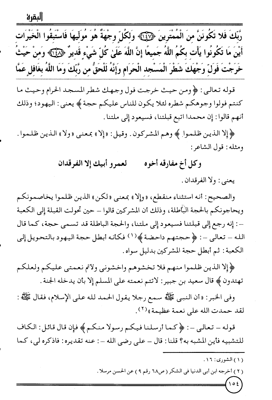 وَالصَّحِيح: أَنه اسْتثِْنَاء مُنْقَطع، " وَإِلَّا " بِمَعْنى " لَكِن " الَّذين ظلمُوا يخاصمونكم ويحاجونكم بِالْحجَّةِ الْبَاطِلَة، وَذَلِكَ أَن الْمُشْركين قَالُوا حِين تحولت الْقبْلَة إِلَى الْكَعْبَة: إِنَّه رَجَعَ إِلَى قبلتنا فسيعود إِلَى ملتنا، وَالْحجّة الْبَاطِلَة قد تسمى حجَّة، كَمَا قَالَ الله تَعَالَى: {حجتهم داحضة} فَكَأَنَّهُ أبطل حجَّة الْيَهُود بالتحويل إِلَى الْكَعْبَة: ثمَّ أبطل حجَّة الْمُشْركين بِدَلِيل سواهُ.