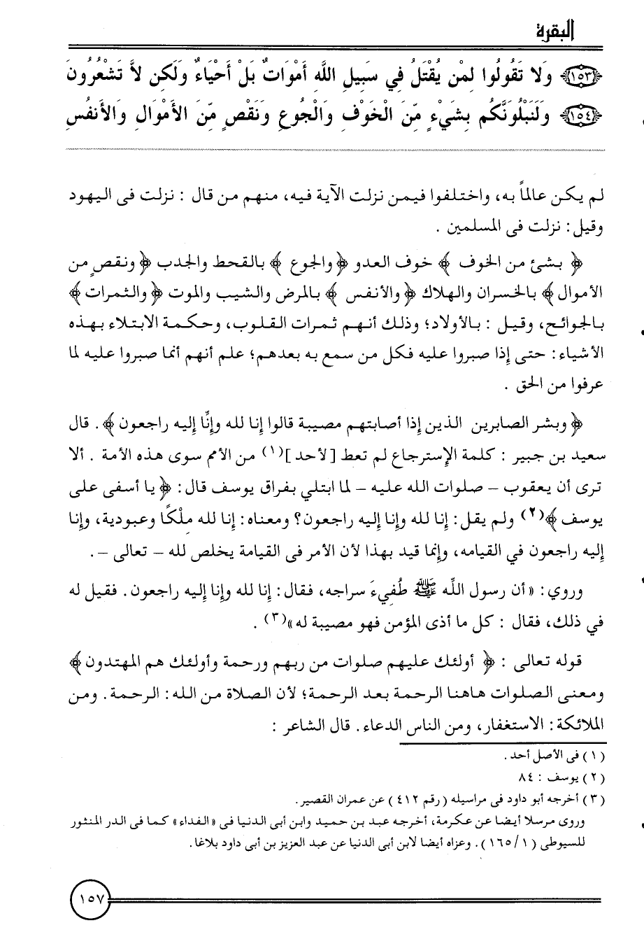 ( {153) وَلَا تَقولُوا لمن يقتل فِي سَبِيل الله أموات بل أَحيَاء وَلَكِن لَا تشعرون (154) ولنبلونكم بِشَيْء من الْخَوْف والجوع وَنقص من الْأَمْوَال والأنفس لم يكن عَالما بِهِ، وَاخْتلفُوا فِيمَن نزلت الْآيَة فِيهِ، مِنْهُم من قَالَ: نزلت فِي الْيَهُود وَقيل: نزلت فِي الْمُسلمين.