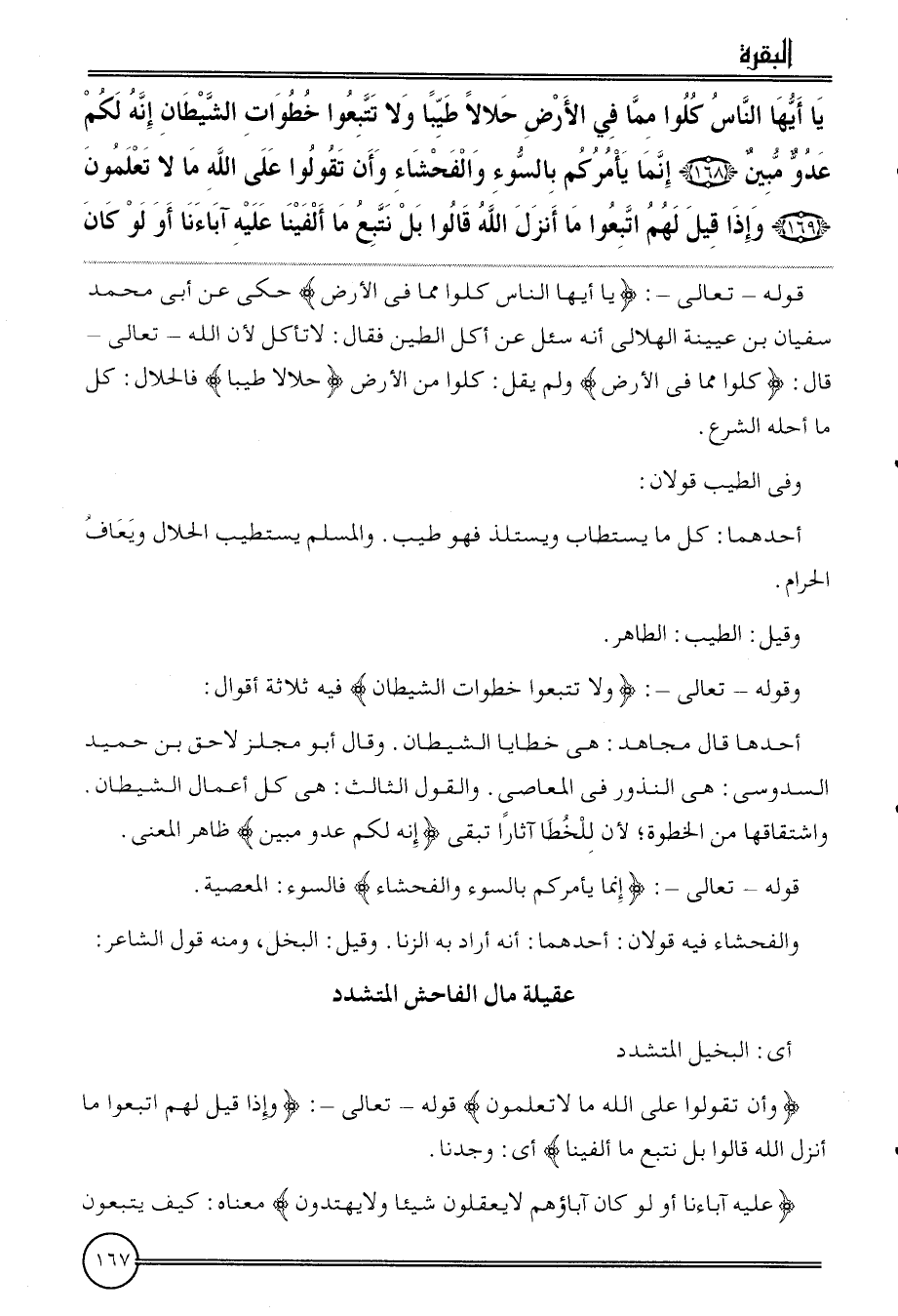{يَا أَيهَا النَّاس كلوا مِمَّا فِي الأَرْض حَلَالا طيبا وَلَا تتبعوا خطوَات الشَّيْطَان إِنَّه لكم عَدو مُبين (168) إِنَّمَا يَأْمُركُمْ بالسوء والفحشاء وَأَن تَقولُوا على الله مَالا تعلمُونَ (169) وَإِذا قيل لَهُم اتبعُوا مَا أنزل الله قَالُوا بل نتبع مَا ألفينا عَلَيْهِ آبَاءَنَا أَو لَو كَانَ}
