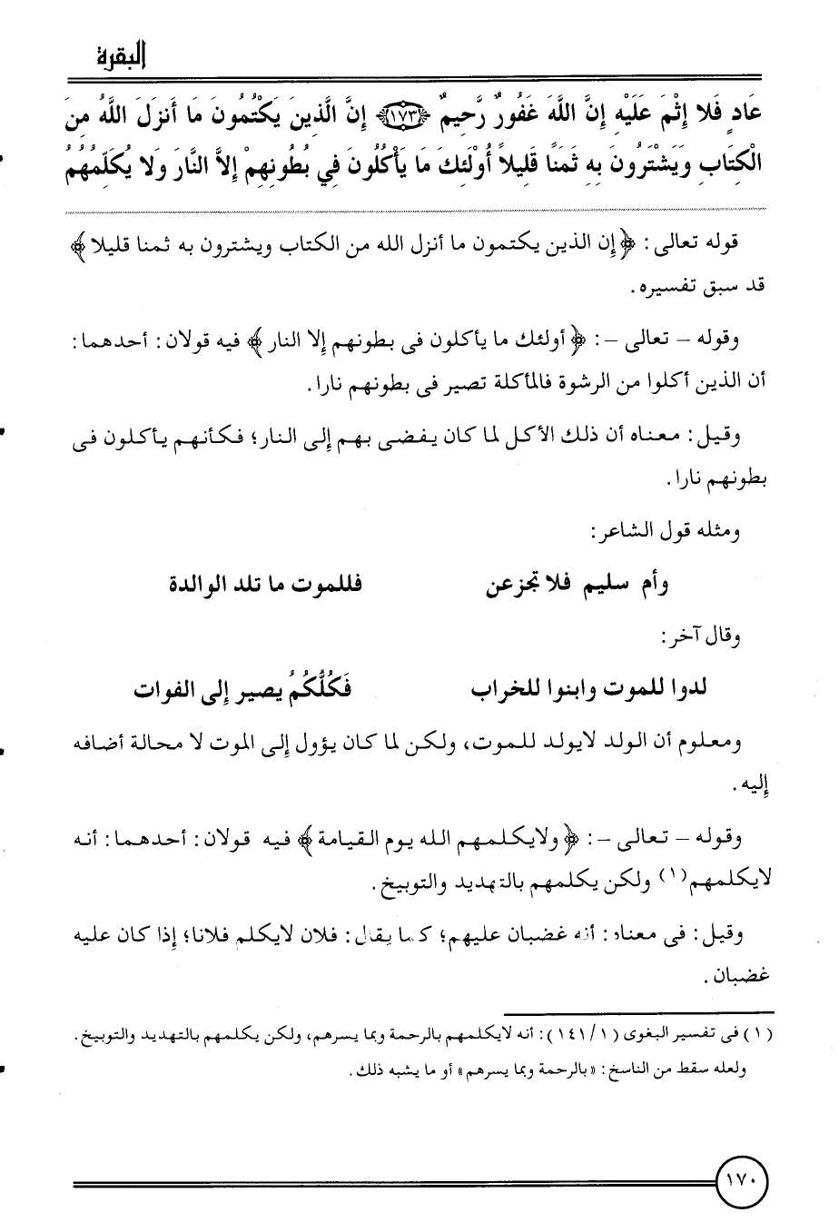 {عَاد فَلَا إِثْم عَلَيْهِ إِن الله غَفُور رَحِيم (173) إِن الَّذين يكتمون مَا أنزل الله من الْكتاب ويشترون بِهِ ثمنا قَلِيلا أُولَئِكَ مَا يَأْكُلُون فِي بطونهم إِلَّا النَّار وَلَا يكلمهم}