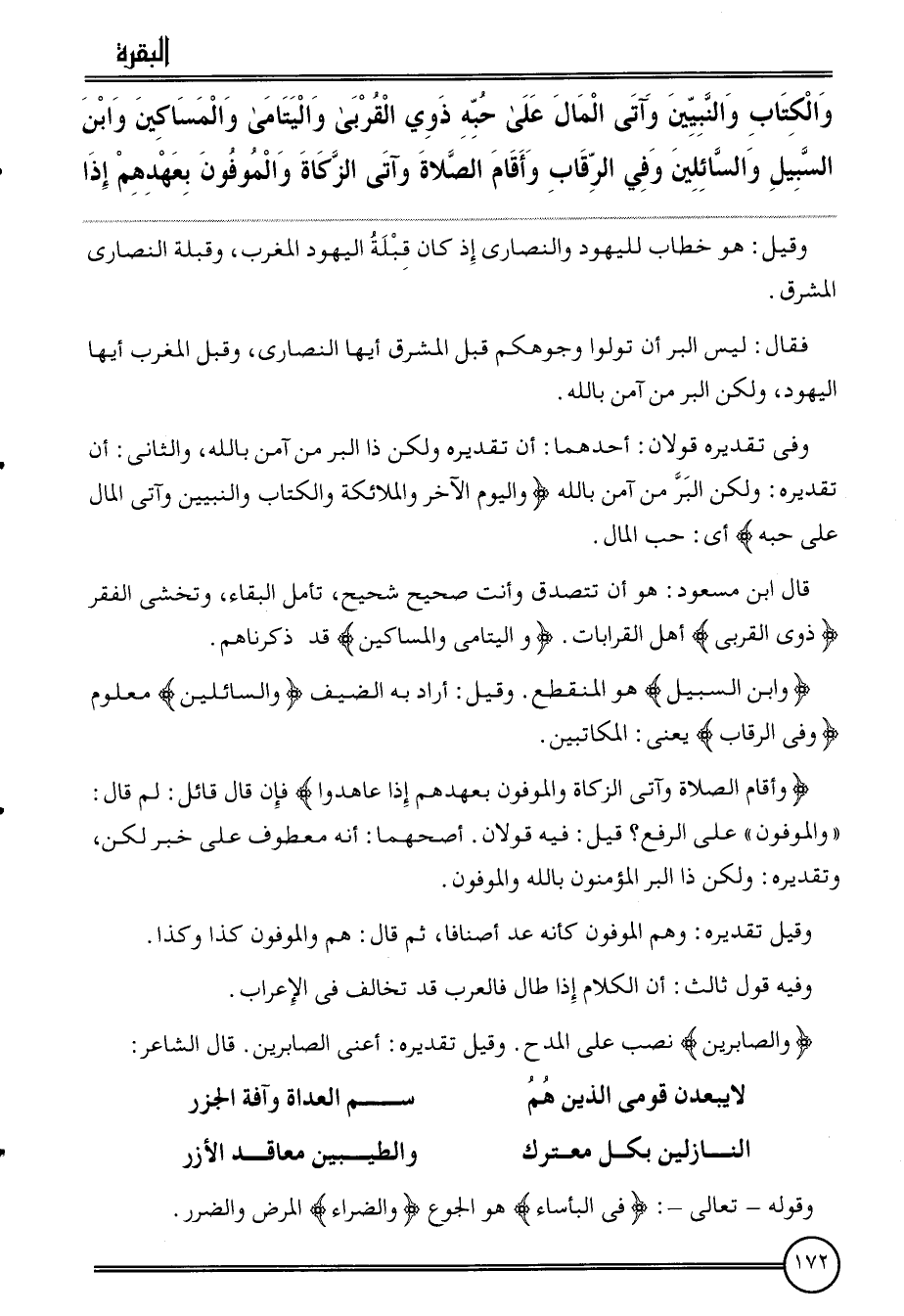 {وَالْكتاب والنبيين وَآتى المَال على حبه ذَوي الْقُرْبَى واليتامى وَالْمَسَاكِين وَابْن السَّبِيل والسائلين وَفِي الرّقاب وَأقَام الصَّلَاة وَآتى الزَّكَاة والموفون بعهدهم إِذا}