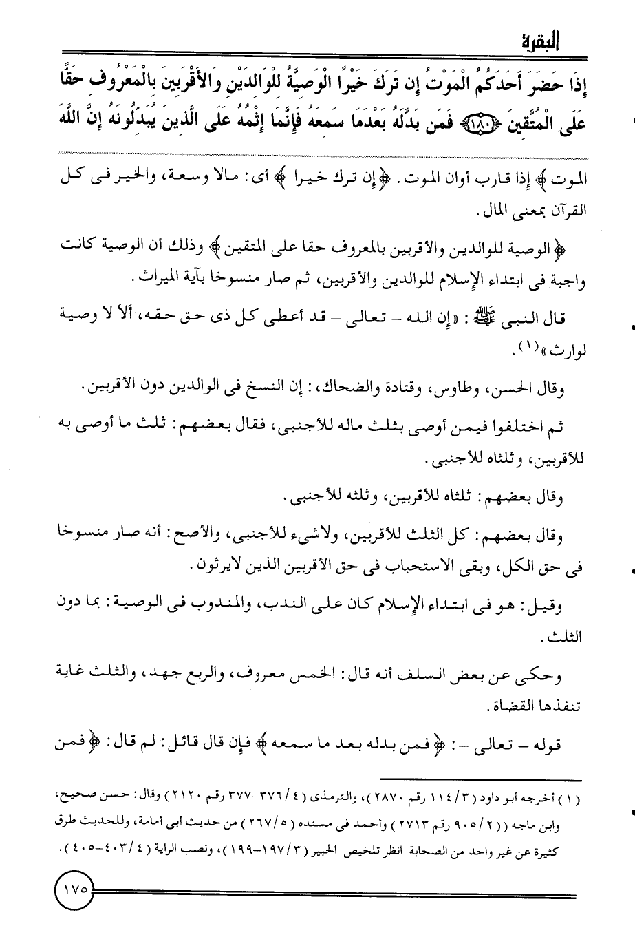 {إِذا حضر أحدكُم الْمَوْت إِن ترك خيرا الْوَصِيَّة للْوَالِدين والأقربين بِالْمَعْرُوفِ حَقًا على الْمُتَّقِينَ (180) فَمن بدله بَعْدَمَا سَمعه فَإِنَّمَا إثمه على الَّذين يبدلونه إِن الله} الْمَوْت) إِذا قَارب أَوَان الْمَوْت. {إِن ترك خيرا} أَي: مَالا وسعة، وَالْخَيْر فِي كل الْقُرْآن بِمَعْنى المَال.
