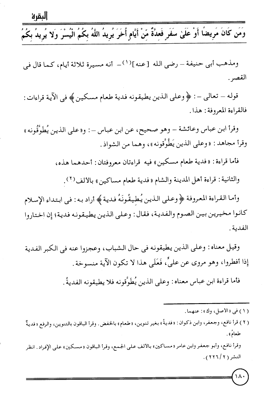 وَأما الْقِرَاءَة الْمَعْرُوفَة {وعَلى الَّذين يطيقُونَهُ فديَة} أَرَادَ بِهِ: فِي ابْتِدَاء الْإِسْلَام كَانُوا مخيرين بَين الصَّوْم والفدية، فَقَالَ: وعَلى الَّذين يطيقُونَهُ فديَة؛ إِن اخْتَارُوا الْفِدْيَة.