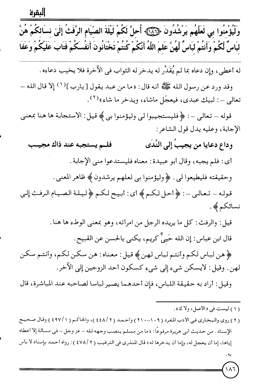 {وليؤمنوا بِي لَعَلَّهُم يرشدون (186) أحل لكم لَيْلَة الصّيام الرَّفَث إِلَى نِسَائِكُم هن لِبَاس لكم وَأَنْتُم لِبَاس لَهُنَّ علم الله أَنكُمْ كُنْتُم تختانون أَنفسكُم فَتَابَ عَلَيْكُم وَعَفا لَهُ أعْطى، وَإِن دَعَاهُ بِمَا لم يقدر لَهُ يدّخر لَهُ الثَّوَاب فِي الْآخِرَة فَلَا يخيب دعاءه.