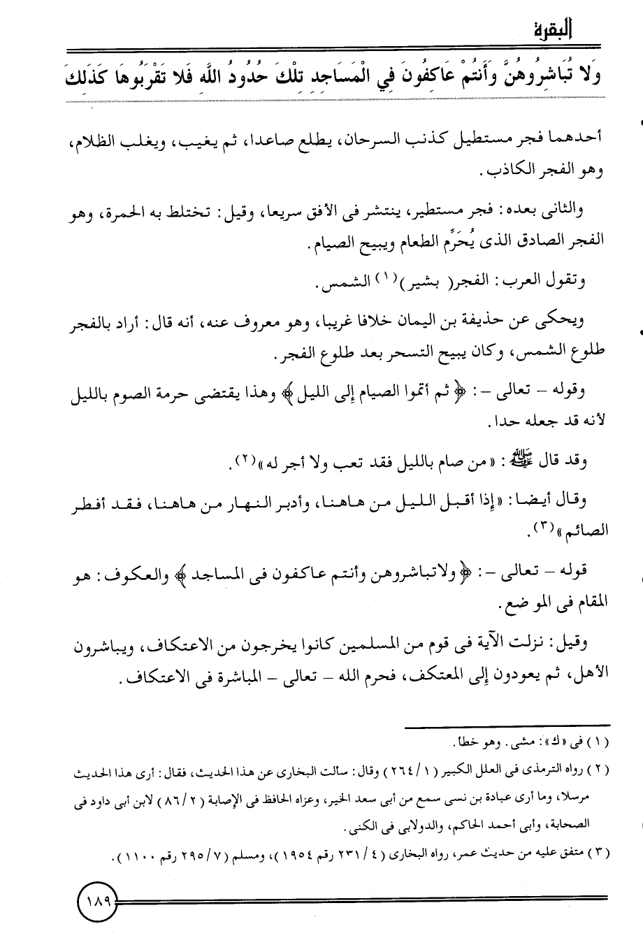 {وَلَا تباشروهن وَأَنْتُم عاكفون فِي الْمَسَاجِد تِلْكَ حُدُود الله فَلَا تقربوها كَذَلِك} أَحدهمَا فجر مستطيل كذنب السرحان، يطاع صاعدا، ثمَّ يغيب، ويغلب الظلام، وَهُوَ الْفجْر الْكَاذِب.