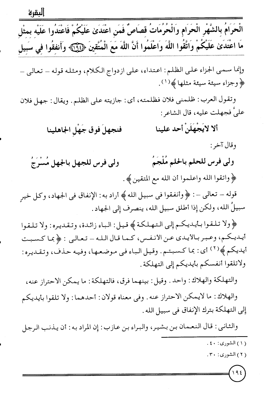 {الْحَرَام بالشهر الْحَرَام والحرمات قصاص فَمن اعْتدى عَلَيْكُم فاعتدوا عَلَيْهِ بِمثل مَا اعْتدى عَلَيْكُم وَاتَّقوا الله وَاعْلَمُوا أَن الله مَعَ الْمُتَّقِينَ (194) وأنفقوا فِي سَبِيل وَإِنَّمَا سمى الْجَزَاء على الظُّلم: اعتداء، على ازدواج الْكَلَام، وَمثله قَوْله تَعَالَى {وَجَزَاء سَيِّئَة سَيِّئَة مثلهَا} .