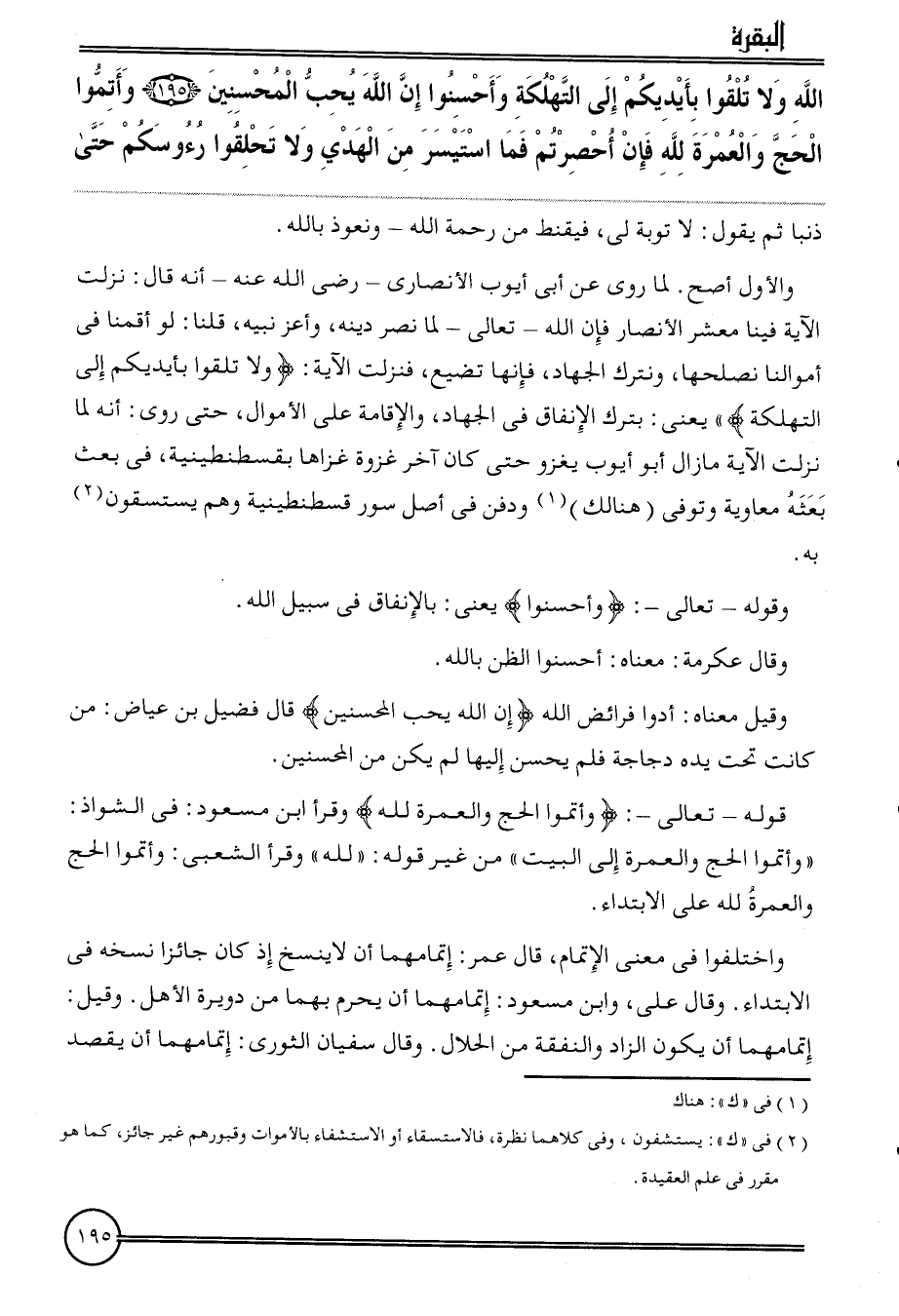 وَالْأول أصح. لما روى عَن أبي أَيُّوب الْأنْصَارِيّ رَضِي الله عَنهُ أَنه قَالَ: نزلت الْآيَة فِينَا معشر الْأَنْصَار فَإِن الله تَعَالَى لما نصر دنيه، وأعز نبيه، قُلْنَا: لَو أَقَمْنَا فِي أَمْوَالنَا نُصْلِحهَا، ونترك الْجِهَاد، فَإِنَّهَا تضيع، فَنزلت الْآيَة: {وَلَا تلقوا بِأَيْدِيكُمْ إِلَى التَّهْلُكَة} يَعْنِي: بترك الْإِنْفَاق فِي الْجِهَاد، وَالْإِقَامَة على الْأَمْوَال، حَتَّى روى: أَنه لما نزلت الْآيَة مازال أَبُو أَيُّوب يَغْزُو حَتَّى آخر غَزْوَة غَزَاهَا بقسطنطينية، فِي بعث بعثة مُعَاوِيَة وَتُوفِّي (هُنَالك) وَدفن فِي أصل سور قسطنطينية وهم يستسقون بِهِ.