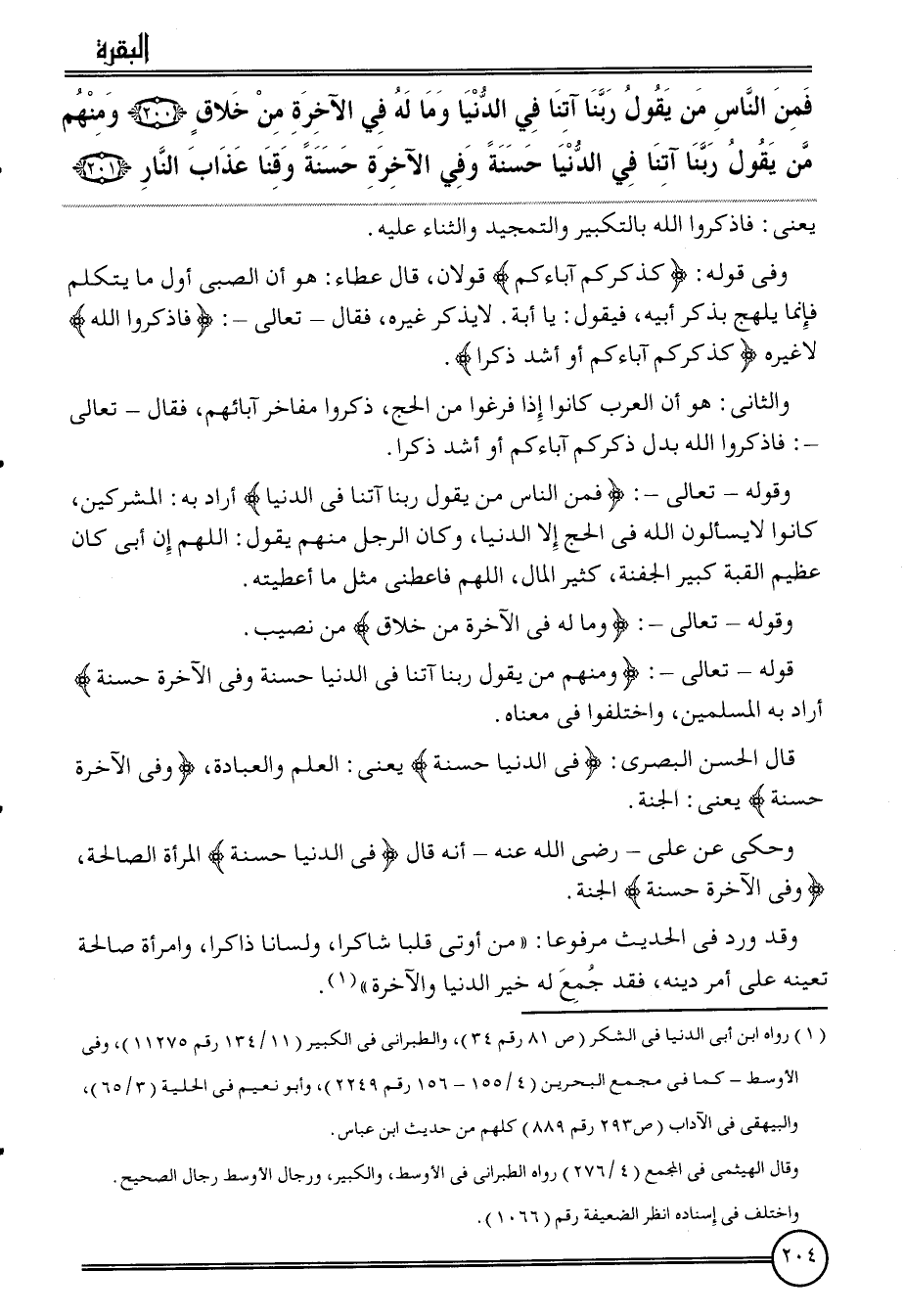 {فَمن النَّاس من يَقُول رَبنَا آتنا فِي الدُّنْيَا وَمَا لَهُ فِي الْآخِرَة من خلاق (200) وَمِنْهُم من يَقُول رَبنَا آتنا فِي الدُّنْيَا حَسَنَة وَفِي الْآخِرَة حَسَنَة وقنا عَذَاب النَّار (201) } يَعْنِي: فاذكروا الله بِالتَّكْبِيرِ والتمجيد وَالثنَاء عَلَيْهِ.