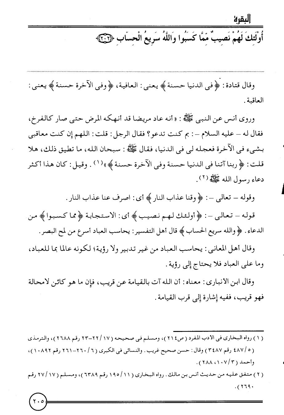 وروى أنس عَن النَّبِي: " أَنه عَاد مَرِيضا قد أنهكه الْمَرَض حَتَّى صَار كالفرخ، فَقَالَ لَهُ عَلَيْهِ السَّلَام بِمَ كنت تَدْعُو؟ فَقَالَ الرجل: قلت: اللَّهُمَّ إِن كنت معاقبي بِشَيْء فِي الْآخِرَة فعجله لي فِي الدُّنْيَا، فَقَالَ: سُبْحَانَ الله، مَا تطِيق ذَلِك، هلا قلت: {رَبنَا آتنا فِي الدُّنْيَا حَسَنَة وَفِي الْآخِرَة حَسَنَة} ". وَقيل: كَانَ هَذَا أَكثر دُعَاء رَسُول الله.