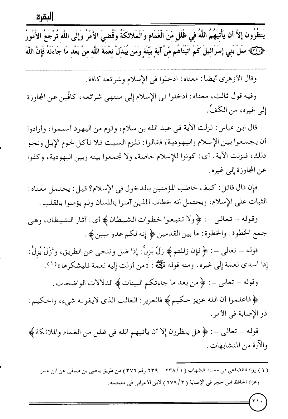 قَالَ ابْن عَبَّاس: نزلت الْآيَة فِي عبد الله بن سَلام، وَقوم من الْيَهُود أَسْلمُوا، وَأَرَادُوا أَن يجمعوا بَين الْإِسْلَام واليهودية، فَقَالُوا: نلزم السبت فَلَا نَأْكُل لُحُوم الْإِبِل وَنَحْو ذَلِك، فَنزلت الْآيَة. أَي: كونُوا لِلْإِسْلَامِ خَاصَّة، وَلَا تجمعُوا بَينه وَبَين الْيَهُودِيَّة، وَكفوا عَن الْمُجَاوزَة إِلَى غَيره.