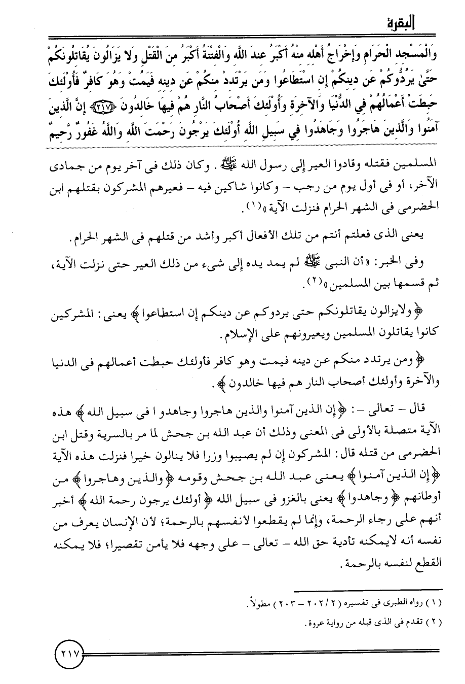 {وَالْمَسْجِد الْحَرَام وَإِخْرَاج أَهله مِنْهُ أكبر عِنْد الله والفتنة أكبر من الْقَتْل وَلَا يزالون يقاتلونكم حَتَّى يردوكم عَن دينكُمْ إِن اسْتَطَاعُوا وَمن يرْتَد مِنْكُم عَن دينه فيمت وَهُوَ كَافِر فَأُولَئِك حبطت أَعْمَالهم فِي الدُّنْيَا وَالْآخِرَة وَأُولَئِكَ أَصْحَاب النَّار هم فِيهَا خَالدُونَ (217) إِن الَّذين آمنُوا وَالَّذين هَاجرُوا وَجَاهدُوا فِي سَبِيل الله أُولَئِكَ يرجون رحمت الله وَالله غَفُور رَحِيم} الْمُسلمين فَقتله وقادوا العير إِلَى رَسُول الله. وَكَانَ ذَلِك فِي آخر يَوْم من جُمَادَى الآخر، أَو فِي أول يَوْم من رَجَب وَكَانُوا شاكين فِيهِ فعيرهم الْمُشْركُونَ بِقَتْلِهِم ابْن الْحَضْرَمِيّ فِي الشَّهْر الْحَرَام فَنزلت الْآيَة ".