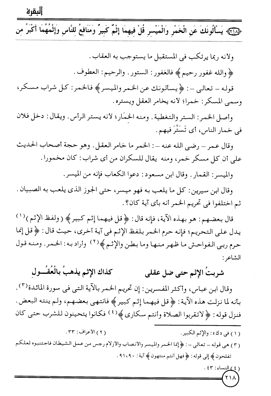 ( {218) يَسْأَلُونَك عَن الْخمر وَالْميسر قل فيهمَا إِثْم كَبِير وَمَنَافع للنَّاس وإثمهما أكبر من}