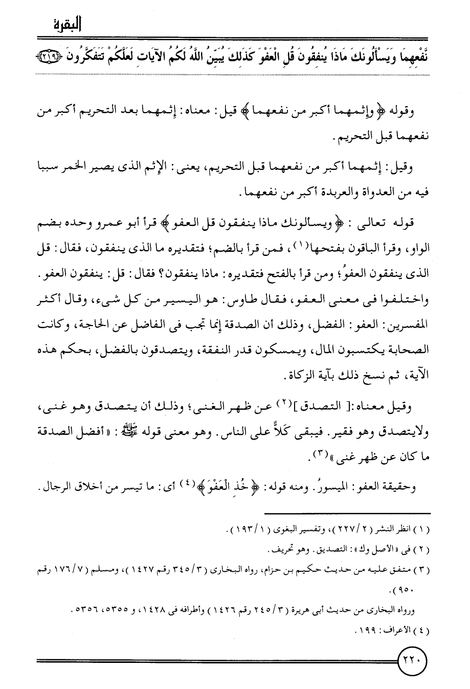 قَوْله تَعَالَى: {ويسألونك مَاذَا يُنْفقُونَ قل الْعَفو} قَرَأَ أَبُو عَمْرو وَحده بِضَم الْوَاو، وَقَرَأَ الْبَاقُونَ بِفَتْحِهَا، فَمن قَرَأَ بِالضَّمِّ؛ فتقديره مَا الَّذِي يُنْفقُونَ، فَقَالَ: قل الَّذِي يُنْفقُونَ الْعَفو؛ وَمن قَرَأَ بِالْفَتْح فتقديره: مَاذَا يُنْفقُونَ؟ فَقَالَ: قل: يُنْفقُونَ الْعَفو. وَاخْتلفُوا فِي معنى الْعَفو، فَقَالَ طَاوس: هُوَ الْيَسِير من كل شَيْء، وَقَالَ أَكثر الْمُفَسّرين: الْعَفو: الْفضل، وَذَلِكَ أَن الصَّدَقَة إِنَّمَا تجب فِي الْفَاضِل عَن الْحَاجة، وَكَانَت الصَّحَابَة يكتسبون المَال، ويمسكون قدر النَّفَقَة، وَيَتَصَدَّقُونَ بِالْفَضْلِ، بِحكم هَذِه الْآيَة، ثمَّ نسخ ذَلِك بِآيَة الزَّكَاة.