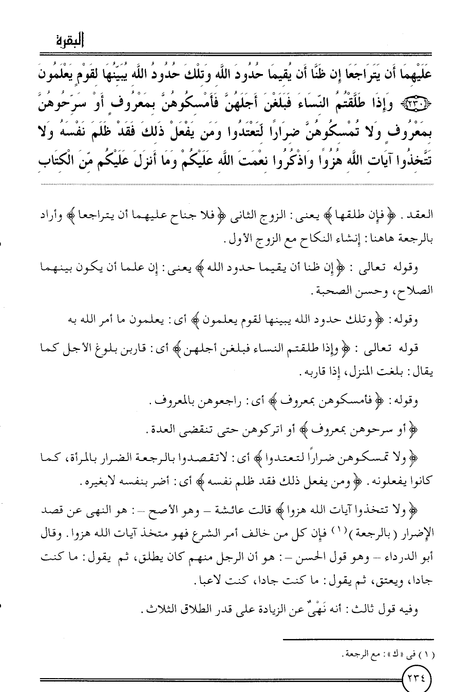 {عَلَيْهِمَا أَن يتراجعا إِن ظنا أَن يُقِيمَا حُدُود الله وَتلك حُدُود الله يبينها لقوم يعلمُونَ (230) وَإِذ طلّقْتُم النِّسَاء فبلغن أَجلهنَّ فأمسكوهن بِمَعْرُوف أَو سرحوهن بِمَعْرُوف وَلَا تمسكوهن ضِرَارًا لتعتدوا وَمن يفعل ذَلِك فقد ظلم نَفسه وَلَا تَتَّخِذُوا آيَات الله هزوا واذْكُرُوا نعمت الله عَلَيْكُم وَمَا أنزل عَلَيْكُم من الْكتاب} العقد. {فَإِن طَلقهَا} يَعْنِي: الزَّوْج الثَّانِي {فَلَا جنَاح عَلَيْهِمَا أَن يتراجعا} وَأَرَادَ بالرجعة هَاهُنَا: إنْشَاء النِّكَاح مَعَ الزَّوْج الأول.