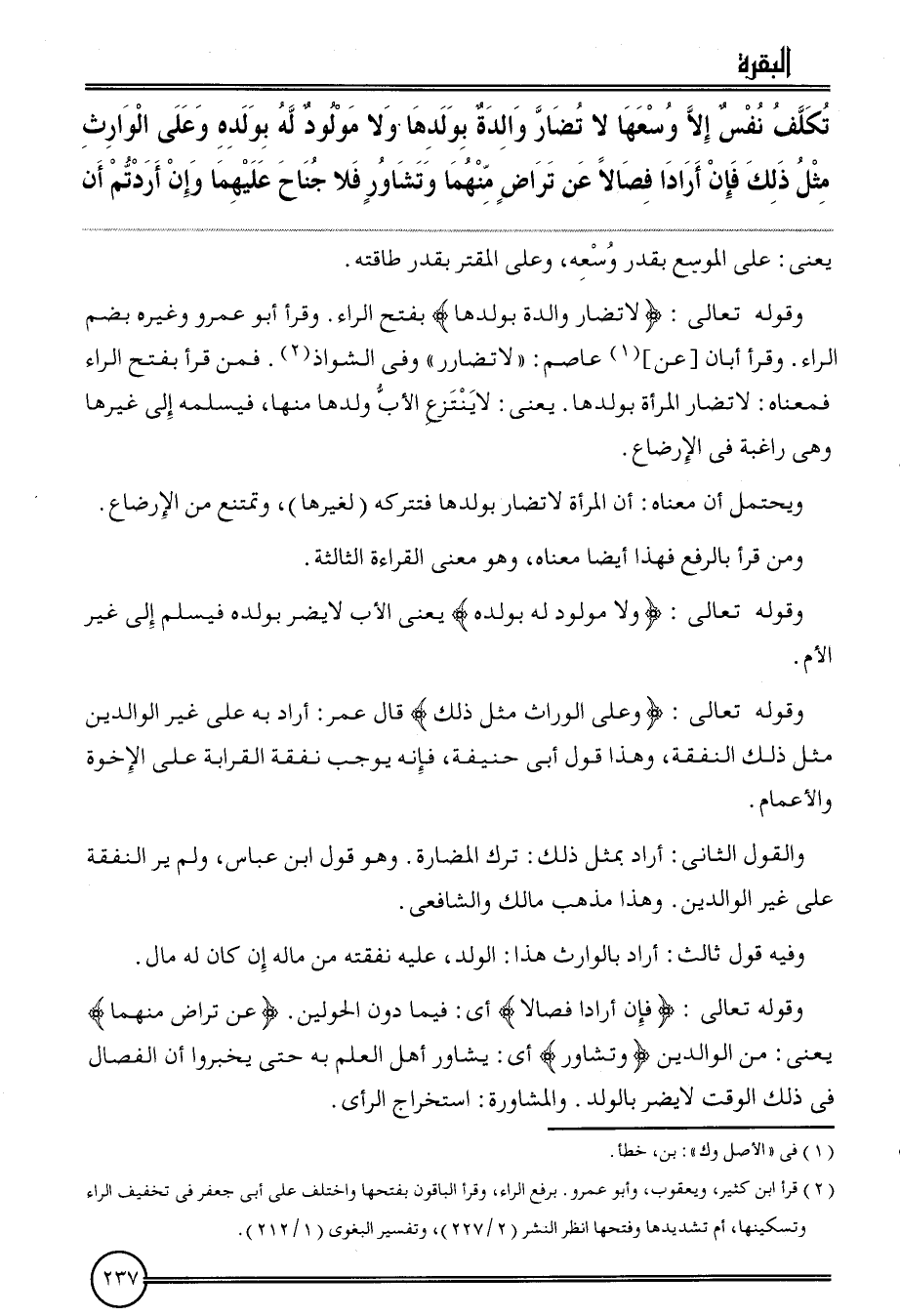 {تكلّف نفس إِلَّا وسعهَا لَا تضار وَالِدَة بِوَلَدِهَا وَلَا مَوْلُود لَهُ بولده وعَلى الْوَارِث مثل ذَلِك فَإِن أَرَادَ فصالا عَن ترَاض مِنْهُمَا وتشاور فَلَا جنَاح عَلَيْهِمَا وَإِن أردتم أَن} يَعْنِي: على الموسع بِقدر وَسعه، وعَلى المقتر بِقدر طاقته.
