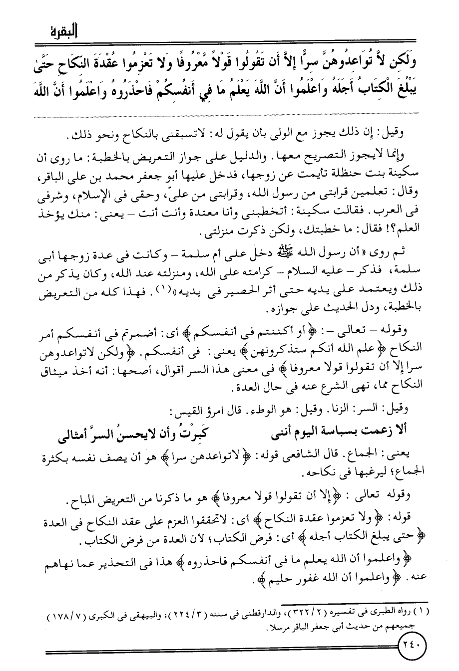 {وَلَكِن لَا تواعدوهن سرا إِلَّا أَن تَقولُوا قولا مَعْرُوفا وَلَا تعزموا عقدَة النِّكَاح حَتَّى يبلغ الْكتاب أَجله وَاعْلَمُوا أَن الله يعلم مَا فِي أَنفسكُم فَاحْذَرُوهُ وَاعْلَمُوا أَن الله}