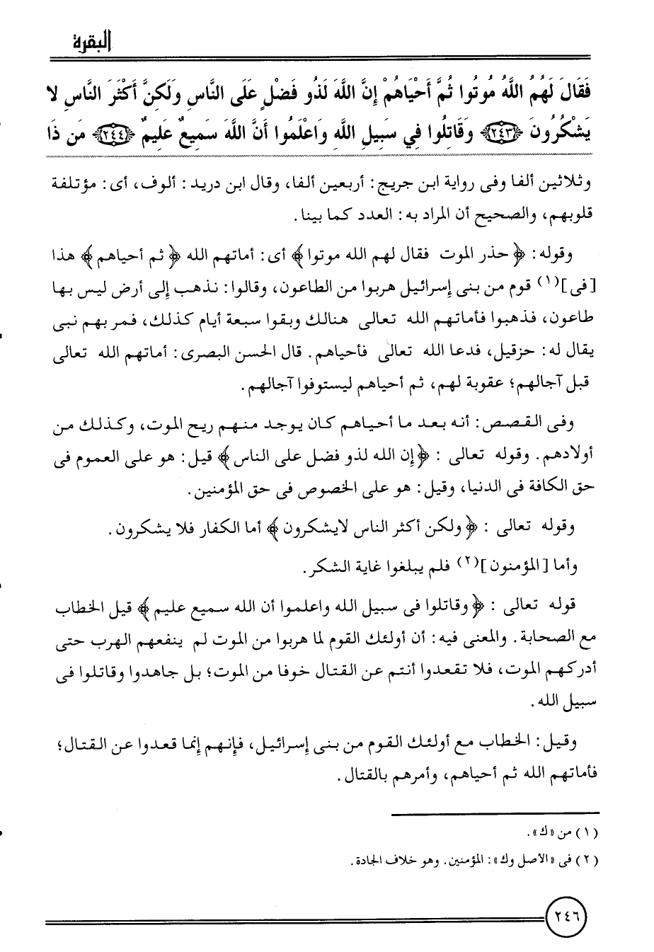 فَقَالَ لَهُم الله موتوا ثمَّ أحياهم إِن الله لذُو فضل على النَّاس وَلَكِن أَكثر النَّاس لَا يشكرون (243) وقاتلوا فِي سَبِيل الله وَاعْلَمُوا أَن الله سميع عليم (244) من ذَا) وَثَلَاثِينَ ألفا وَفِي رِوَايَة ابْن جريج: أَرْبَعِينَ ألفا، وَقَالَ ابْن دُرَيْد: أُلُوف، أَي: مؤتلفة قُلُوبهم، وَالصَّحِيح أَن المُرَاد بِهِ: الْعدَد كَمَا بَينا.