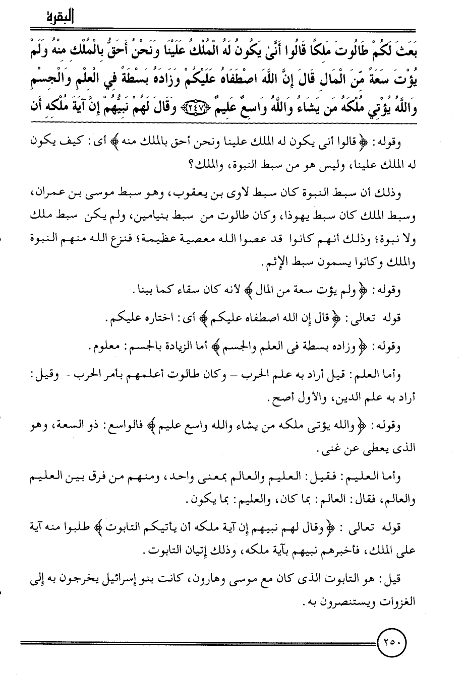 بعث لكم طالوت ملكا قَالُوا أَنى يكون لَهُ الْملك علينا وَنحن أَحَق بِالْملكِ مِنْهُ وَلم يُؤْت سَعَة من المَال قَالَ إِن الله اصطفاه عَلَيْكُم وزاده بسطة فِي الْعلم والجسم وَالله يُؤْتِي ملكه من يَشَاء وَالله وَاسع عليم (247) وَقَالَ لَهُم نَبِيّهم إِن آيَة ملكه أَن)