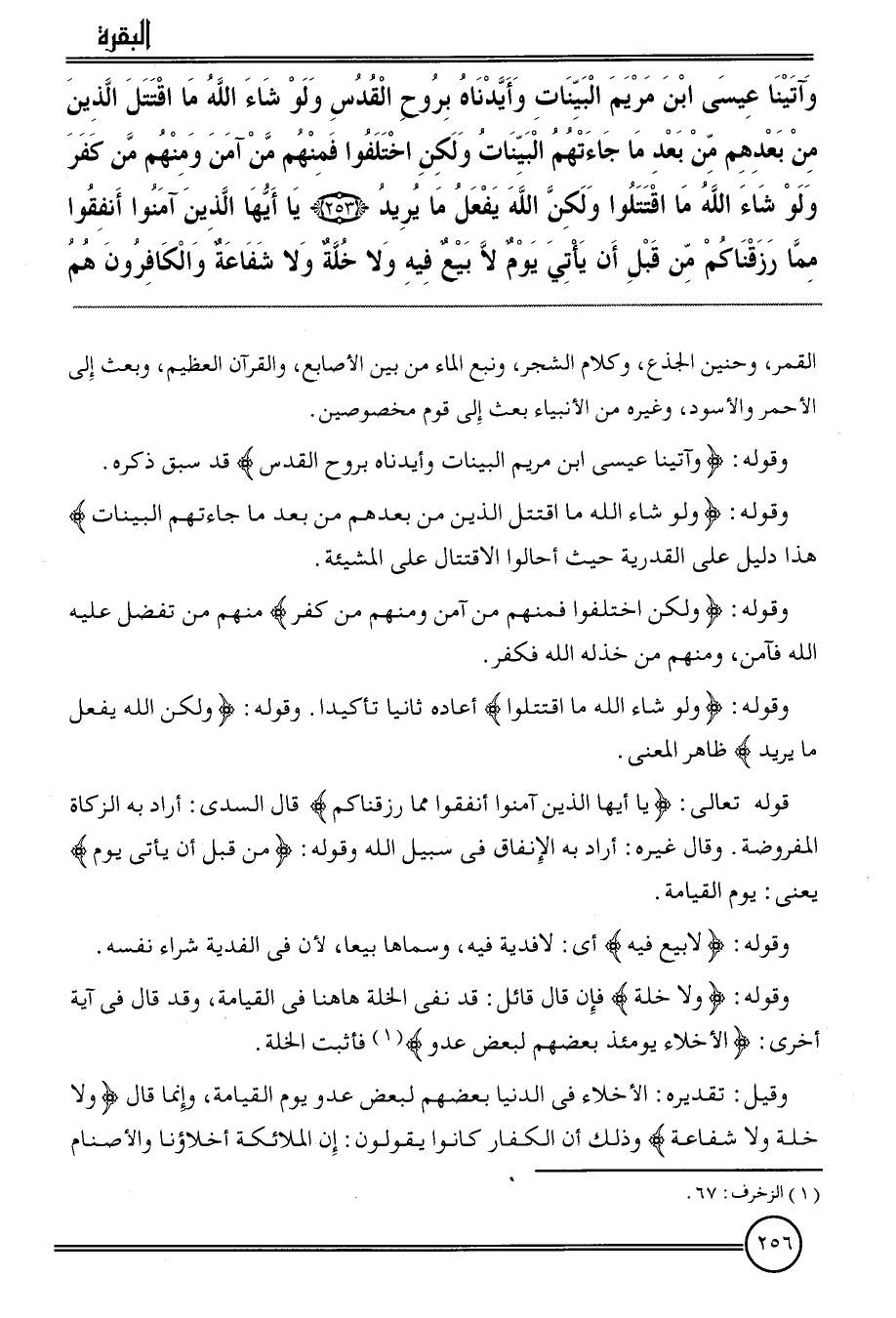{وآتينا عِيسَى ابْن مَرْيَم الْبَينَات وأيدناه بِروح الْقُدس وَلَو شَاءَ الله مَا اقتتل الَّذين من بعدهمْ من بعد مَا جَاءَتْهُم الْبَينَات وَلَكِن اخْتلفُوا فَمنهمْ من آمن وَمِنْهُم من كفر وَلَو شَاءَ الله مَا اقْتَتَلُوا وَلَكِن الله يفعل مَا يُرِيد (253) يَا أَيهَا الَّذين آمنُوا أَنْفقُوا مِمَّا رزقناكم من قبل أَن يَأْتِي يَوْم لَا بيع فِيهِ وَلَا خلة وَلَا شَفَاعَة والكافرون هم} الْقَمَر، وحنين الْجذع، وَكَلَام الشّجر، ونبع المَاء من بَين الْأَصَابِع، وَالْقُرْآن الْعَظِيم، وَبعث إِلَى الْأَحْمَر وَالْأسود، وَغَيره من الْأَنْبِيَاء بعث إِلَى قوم مخصوصين.