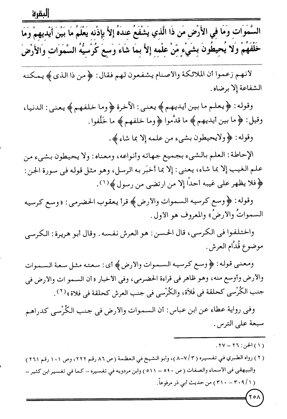 وَمعنى قَوْله: {وسع كرسيه السَّمَاوَات وَالْأَرْض} أَي: سعته مثل سَعَة السَّمَاوَات وَالْأَرْض وأوسع مِنْهُ، وَهُوَ ظَاهر فِي قِرَاءَة الْحَضْرَمِيّ، وَفِي الْأَخْبَار " أَن السَّمَاوَات وَالْأَرْض فِي جنب الْكُرْسِيّ كحلقة فِي فلاة، والكرسي فِي جنب الْعَرْش كحلقة فِي فلاة ".
