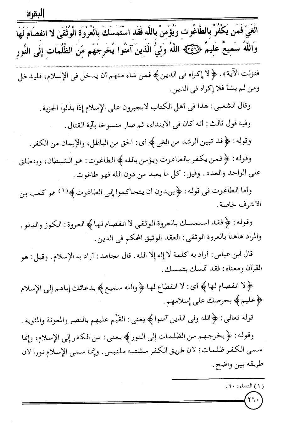 {الغي فَمن يكفر بالطاغوت ويؤمن بِاللَّه فقد استمسك بالعروة الوثقى لَا انفصام لَهَا وَالله سميع عليم (256) الله ولي الَّذين آمنُوا يخرجهم من الظُّلُمَات إِلَى النُّور} فَنزلت الْآيَة ". {لَا إِكْرَاه فِي الدّين} فَمن شَاءَ مِنْهُم أَن يدْخل فِي الْإِسْلَام، فَلْيدْخلْ وَمن لم يَشَأْ فَلَا إِكْرَاه فِي الدّين.