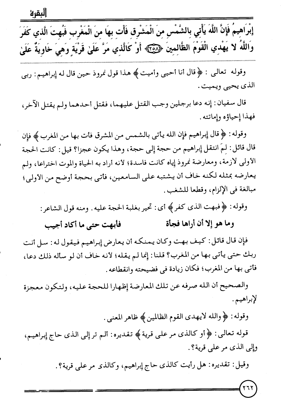 {إِبْرَاهِيم فَإِن الله يَأْتِي بالشمس من الْمشرق فأت بهَا من الْمغرب فبهت الَّذِي كفر وَالله لَا يهدي الْقَوْم الظَّالِمين (258) أَو كَالَّذي مر على قَرْيَة وَهِي خاوية على}