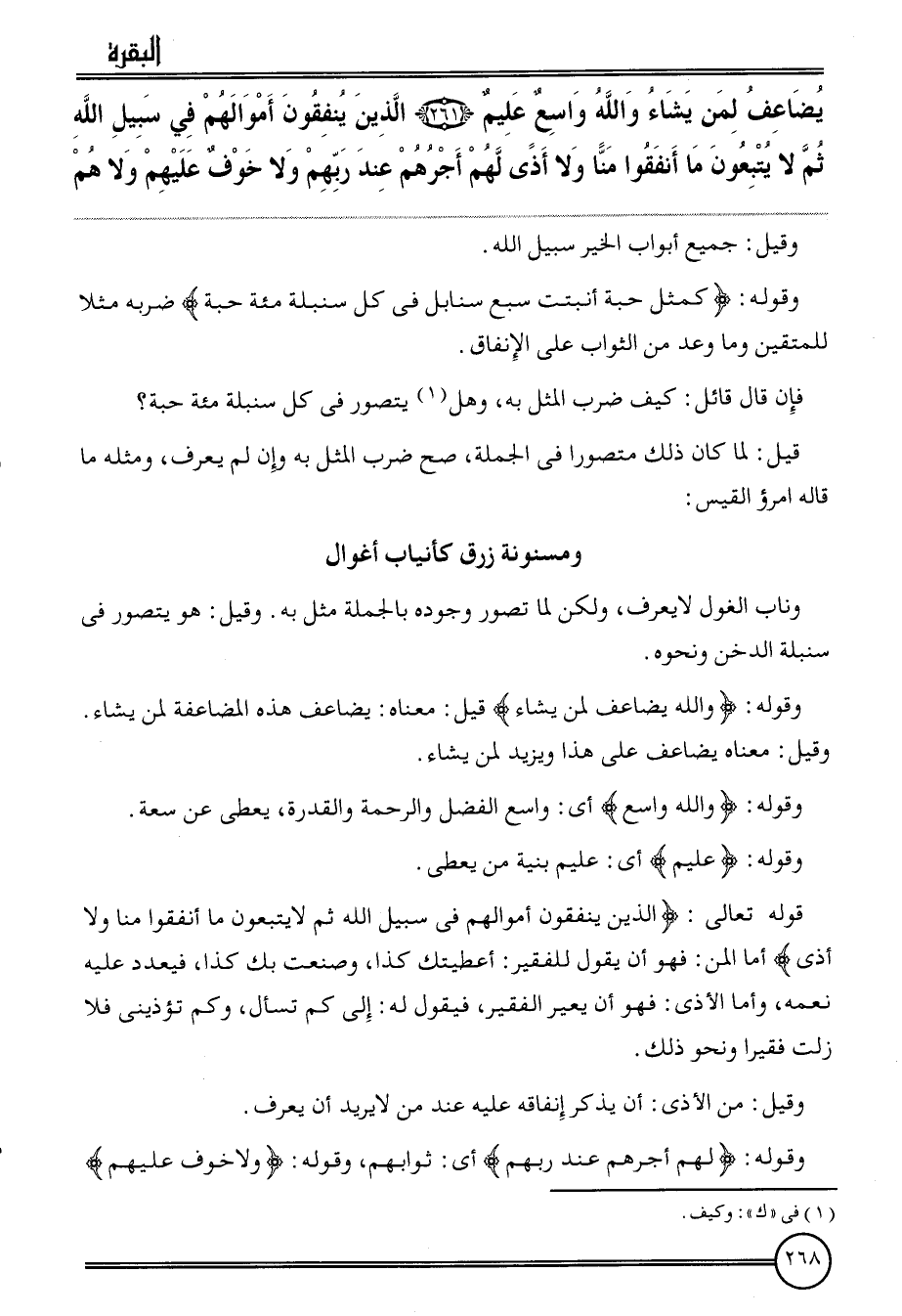 {يُضَاعف لمن يَشَاء وَالله وَاسع عليم (261) الَّذين يُنْفقُونَ أَمْوَالهم فِي سَبِيل الله ثمَّ لَا يتبعُون مَا أَنْفقُوا منا وَلَا أَذَى لَهُم أجرهم عِنْد رَبهم وَلَا خوف عَلَيْهِم وَلَا هم}