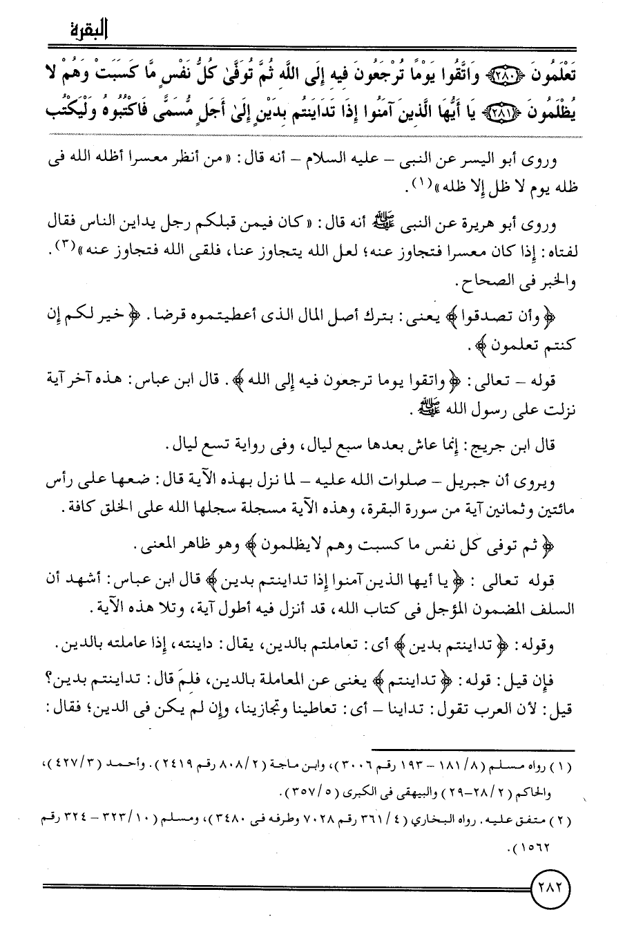 {تعلمُونَ (280) وَاتَّقوا يَوْمًا ترجعون فِيهِ إِلَى الله ثمَّ توفى كل نفس مَا كسبت وهم لَا يظْلمُونَ (281) يَا أَيهَا الَّذين آمنُوا إِذا تداينتم بدين إِلَى أجل مُسَمّى فاكتبوه وليكتب}