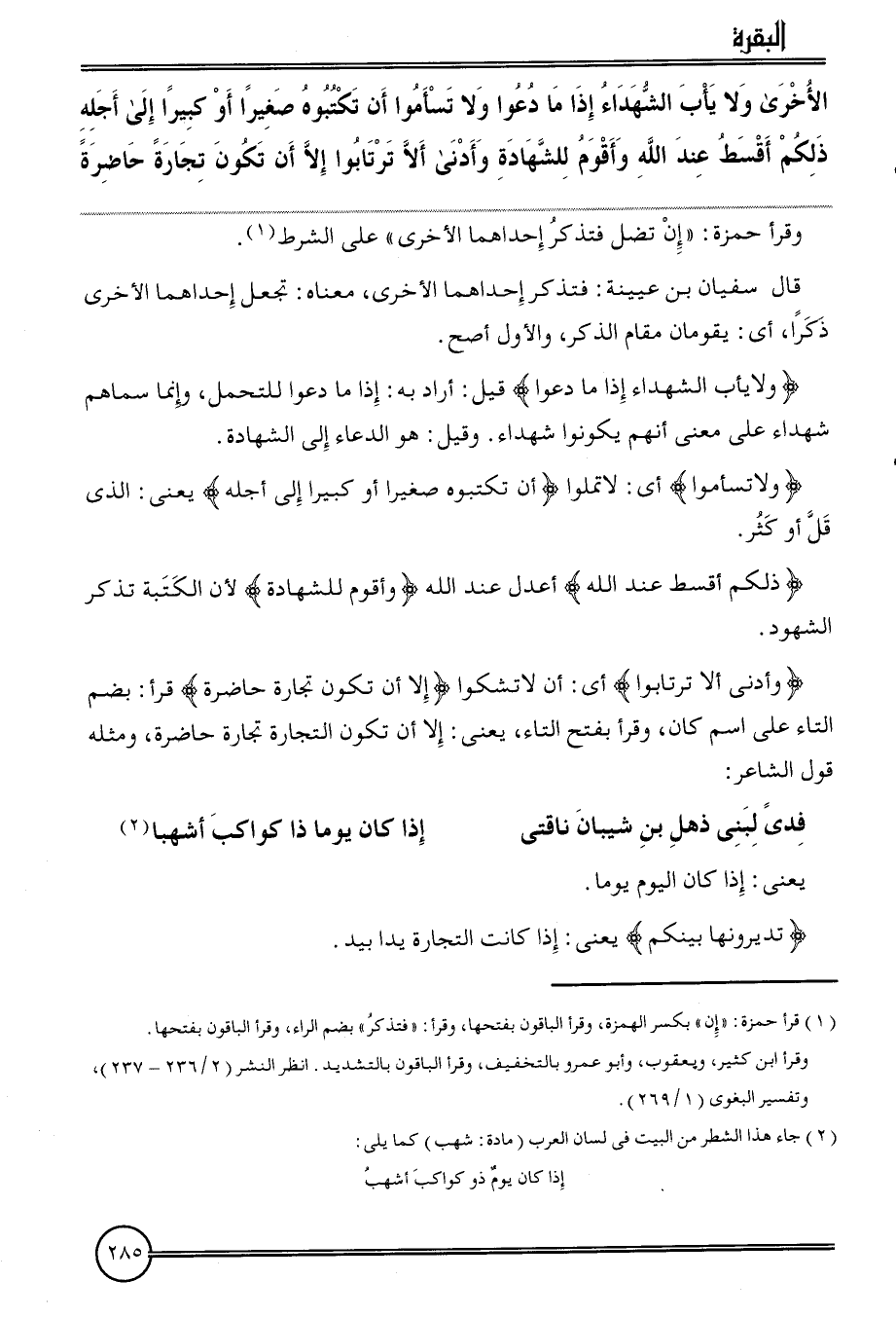 {الْأُخْرَى وَلَا يأب الشُّهَدَاء إِذا مَا دعوا وَلَا تسأموا أَن تكتبوه صَغِيرا أَو كَبِيرا إِلَى أَجله ذَلِكُم أقسط عِنْد الله وأقوم للشَّهَادَة وَأدنى أَلا ترتابوا إِلَّا أَن تكون تِجَارَة حَاضِرَة}