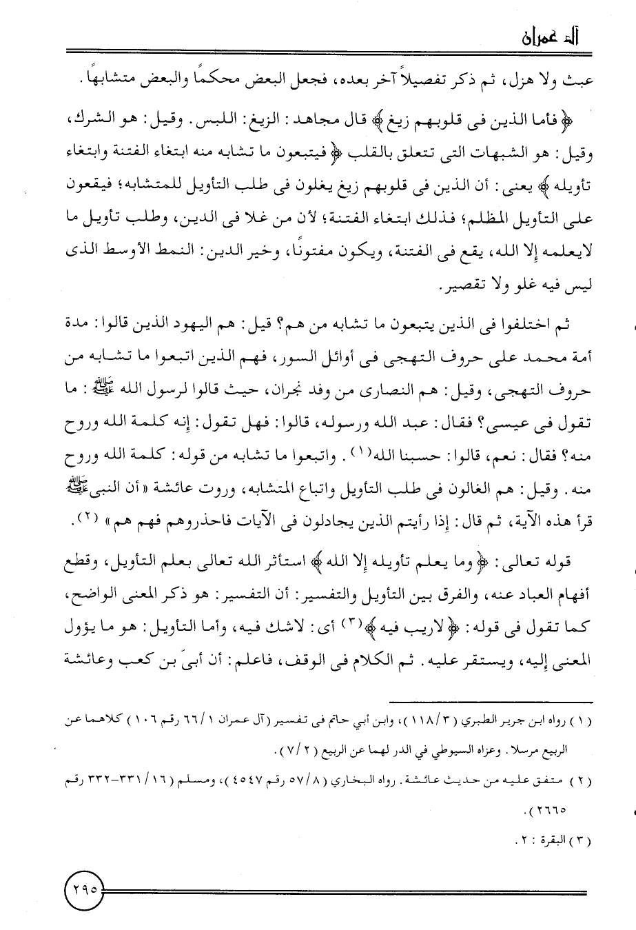 ثمَّ اخْتلفُوا فِي الَّذين يتبعُون مَا تشابه من هم؟ قيل: هم الْيَهُود الَّذين قَالُوا: مُدَّة أمة مُحَمَّد على حُرُوف التهجي، وَقيل: هم النَّصَارَى من وَفد نَجْرَان، حَيْثُ قَالُوا لرَسُول الله: مَا تَقول فِي عِيسَى؟ فَقَالَ: عبد الله وَرَسُوله، قَالُوا: فَهَل تَقول: أَنه كلمة الله وروح مِنْهُ؟ فَقَالَ: نعم، قَالُوا: حَسبنَا الله. وَاتبعُوا مَا تشابه من قَوْله: كلمة الله وروح مِنْهُ. وَقيل: هم الغالون فِي طلب التَّأْوِيل وَاتِّبَاع الْمُتَشَابه، وروت عَائِشَة " أَن النَّبِي قَرَأَ هَذِه الْآيَة، ثمَّ قَالَ: إِذا رَأَيْتُمْ الَّذين يجادلون فِي الْآيَات فاحذروهم فهم هم ".