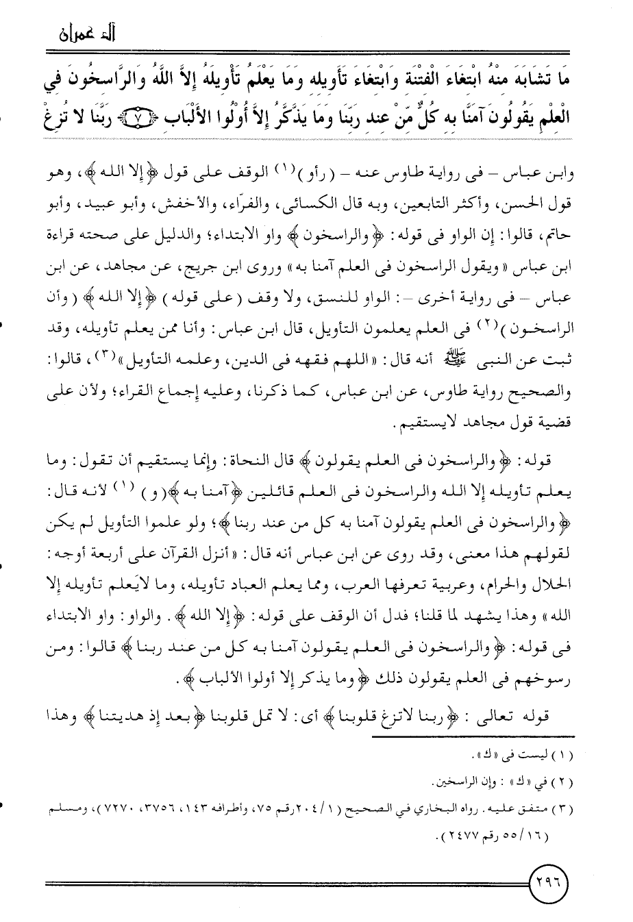 وَابْن عَبَّاس - فِي رِوَايَة طَاوس عَنهُ - (رأو) الْوَقْف على قَول {إِلَّا الله} ، وَهُوَ قَول الْحسن، وَأكْثر التَّابِعين، وَبِه قَالَ الْكسَائي، وَالْفراء، والأخفش، وَأَبُو عبيد، وَأَبُو حَاتِم، قَالُوا: إِن الْوَاو فِي قَوْله: {والراسخون} وَاو الإبتداء؛ وَالدَّلِيل على صِحَّته قِرَاءَة ابْن عَبَّاس " وَيَقُول الراسخون فِي الْعلم آمنا بِهِ " وروى ابْن جريج، عَن مُجَاهِد، عَن ابْن عَبَّاس - فِي رِوَايَة أُخْرَى -: الْوَاو للنسق، وَلَا وقف (على قَوْله) {إِلَّا الله} (وَأَن الراسخون) فِي الْعلم يعلمُونَ التَّأْوِيل، قَالَ ابْن عَبَّاس: وَأَنا مِمَّن يعلم تَأْوِيله، وَقد ثَبت عَن النَّبِي أَنه قَالَ: " اللَّهُمَّ فقهه فِي الدّين وَعلمه التَّأْوِيل "، قَالُوا: وَالصَّحِيح رِوَايَة طَاوس، عَن ابْن عَبَّاس، كَمَا ذكرنَا، وَعَلِيهِ إِجْمَاع الْقُرَّاء؛ وَلِأَن على قَضِيَّة قَول مُجَاهِد لَا يَسْتَقِيم.