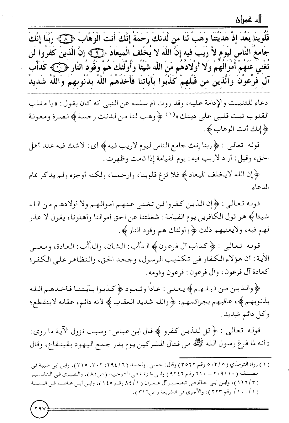 {قُلُوبنَا بعد إِذْ هديتنا وهب لنا من لَدُنْك رَحْمَة إِنَّك أَنْت الْوَهَّاب (8) رَبنَا إِنَّك جَامع النَّاس ليَوْم لَا ريب فِيهِ إِن الله لَا يخلف الميعاد (9) إِن الَّذين كفرُوا لن تغني عَنْهُم أَمْوَالهم وَلَا أَوْلَادهم من الله شَيْئا وَأُولَئِكَ هم وقود النَّار (10) كدأب آل فِرْعَوْن وَالَّذين من قبلهم كذبُوا بِآيَاتِنَا فَأَخذهُم الله بِذُنُوبِهِمْ وَالله شَدِيد}