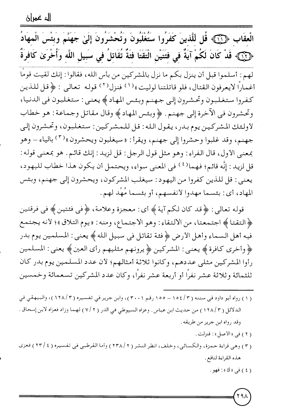 {الْعقَاب (11) قل للَّذين كفرُوا ستغلبون وتحشرون إِلَى جَهَنَّم وَبئسَ المهاد (12) قد كَانَ لكم آيَة فِي فئتين التقيا فِئَة تقَاتل فِي سَبِيل الله وَأُخْرَى كَافِرَة}